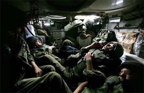Lính Israel ngủ trong một xe bọc thép chở quân (APC) trong một chiến dịch quân sự ở phía bắc Dải Gaza ngày 7/7/2006.