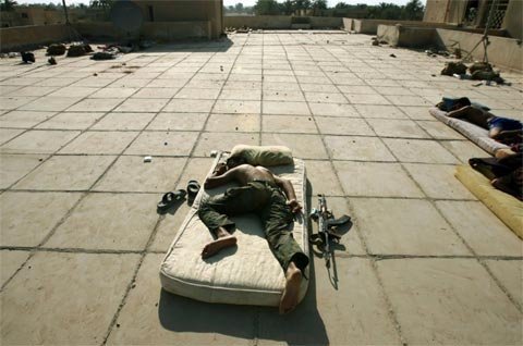 Lính Iraq ngủ cạnh khẩu súng trường Kalashnikov trên mái một căn cứ ở tỉnh Baquba ngày 29/6/2007