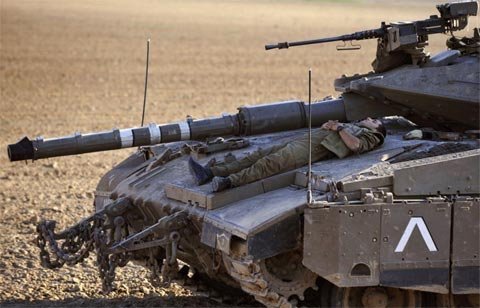 Một binh sĩ Israel ngủ trên mui xe tăng gần Kibbutz Kissufim, ngay bên ngoài miền trung Dải Gaza ngày 5/11/2008.