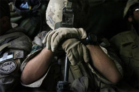 Một binh sĩ Canada thuộc liên quân do NATO đứng đầu gục đầu vào họng súng ngủ khi đang đi trên một xe bọc thép ở tỉnh Kandahar, Afghanistan, ngày 16/10/2007