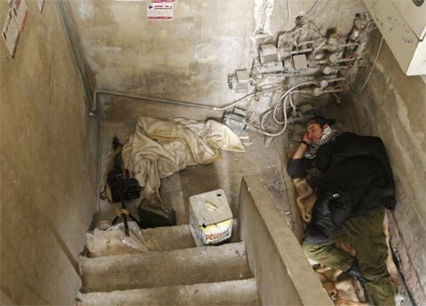 Một chiến binh của Lữ đoàn Tahrir al Sham thuộc Quân đội Syria Giải phóng ngủ tranh thủ giữa chiến sự ác liệt ở ngoại ô Mleha của Damascus ngày 25/1/2013.