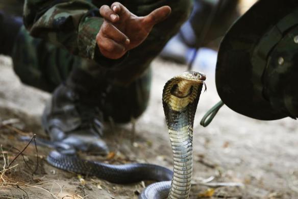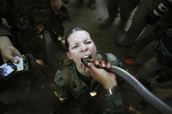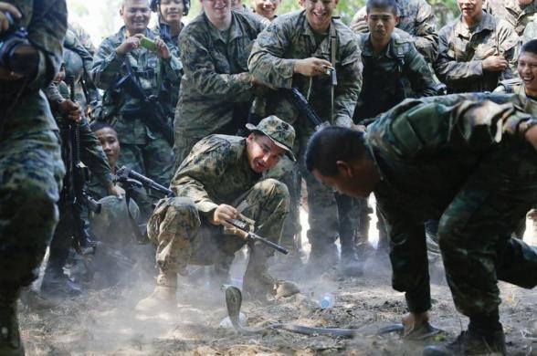 Các lính thủy đánh bộ của Mỹ đã phải uống máu tươi của rắn hổ mang, và ăn sống một con gà tại cứ cứ quân sự tỉnh Chon Buri, hôm 20/2.