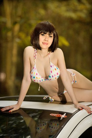 Với màu trắng thiên thần của chiếc Honda Civic độ, Linh Phương tự tin khoe đường cong nóng bỏng trong những bộ đồ bikini nhiều phong cách.