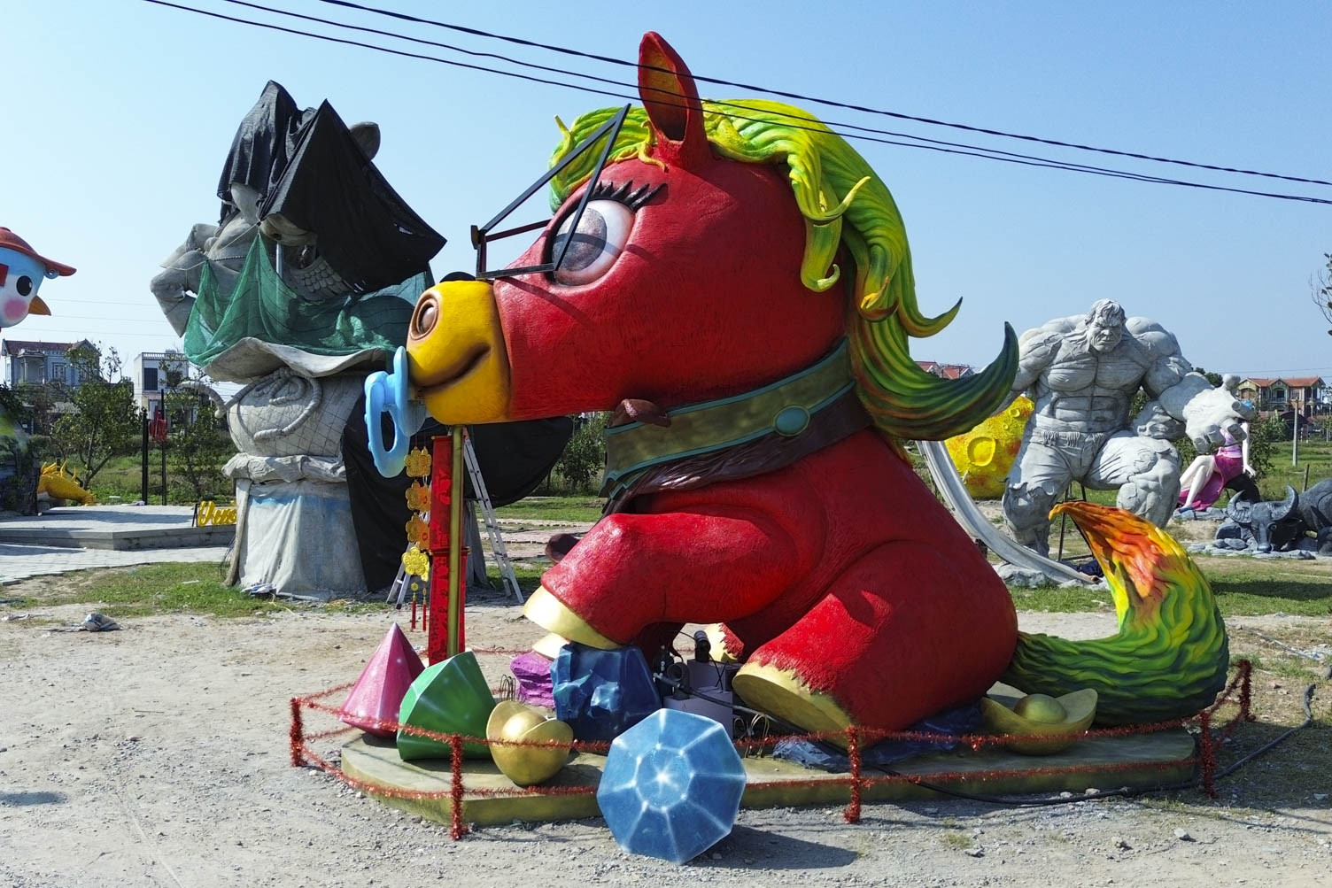 Theo đơn vị thi công, các linh vật ngựa được làm từ nhựa composite nhằm đảm bảo độ bền; lớp sơn vàng và đỏ vừa tăng tính thẩm mỹ, vừa giúp công trình chịu được thời tiết mưa phùn.