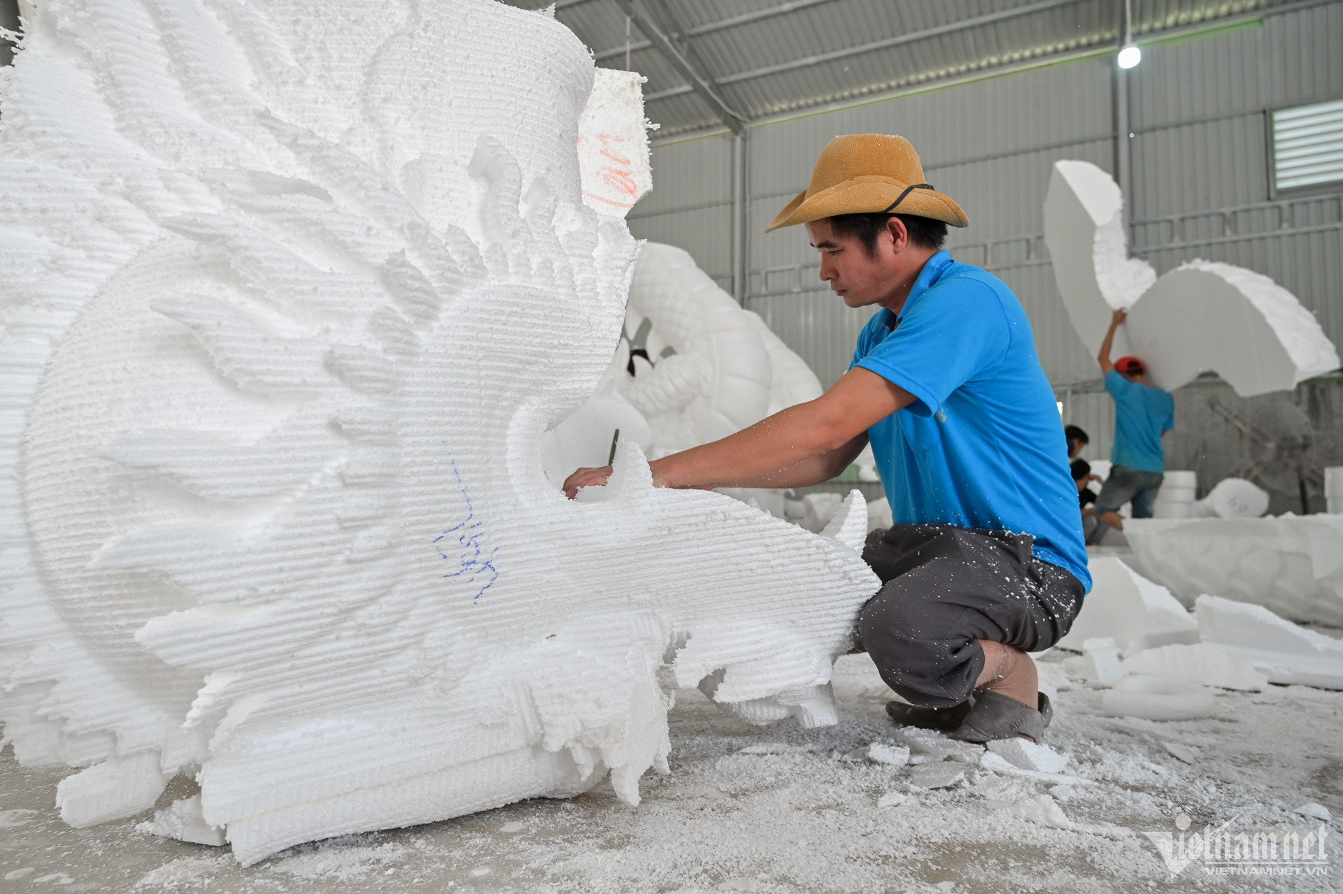 Khi có được một mẫu linh vật rồng dạng thô, thợ bắt tay vào cắt, gọt, tỉa, tạo hình. Tiếp đến là công đoạn chà mài, chà nhám các bề mặt của mô hình xốp để sản phẩm mịn màng, bóng loáng và chạm trổ, điêu khắc.