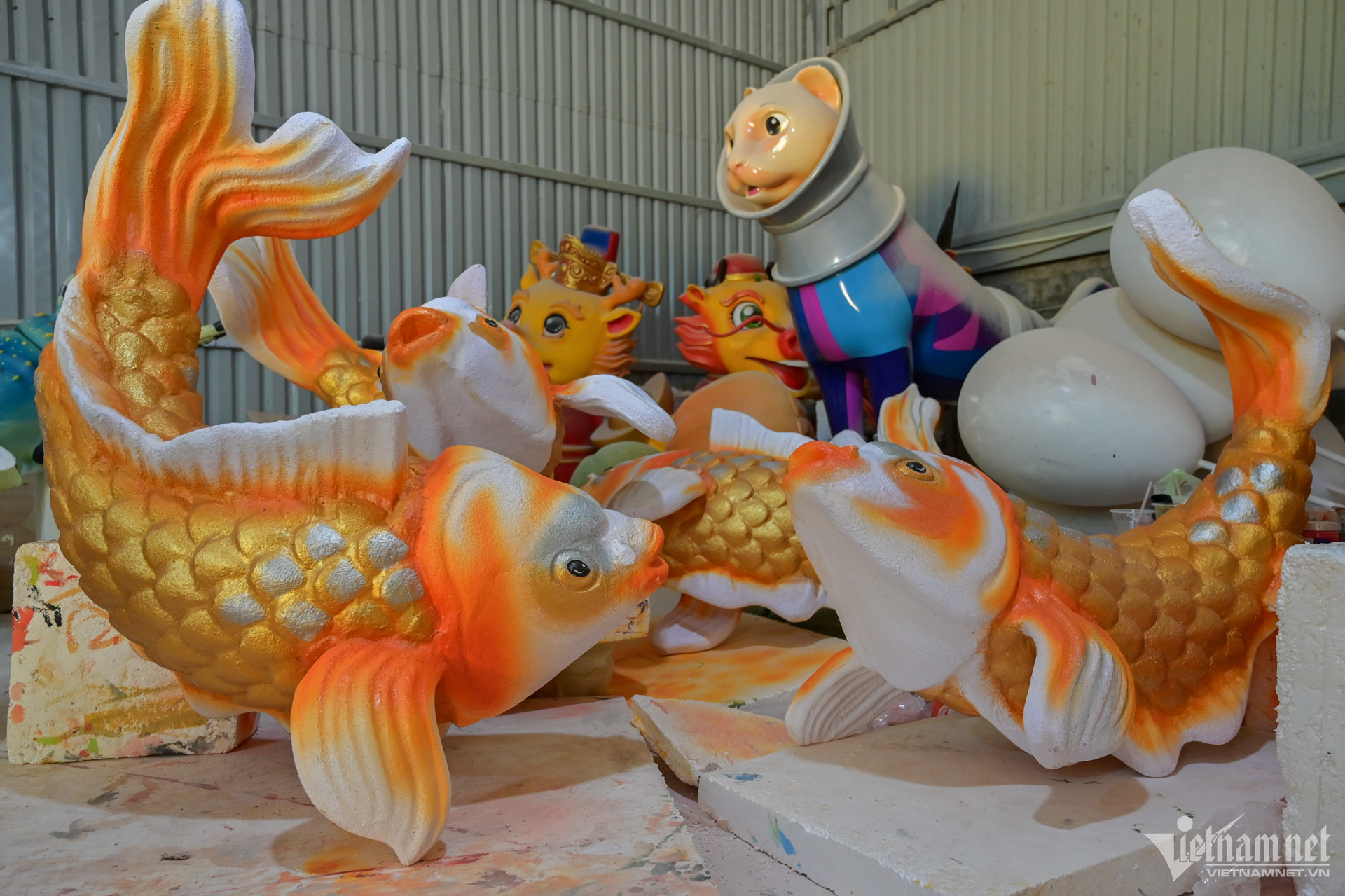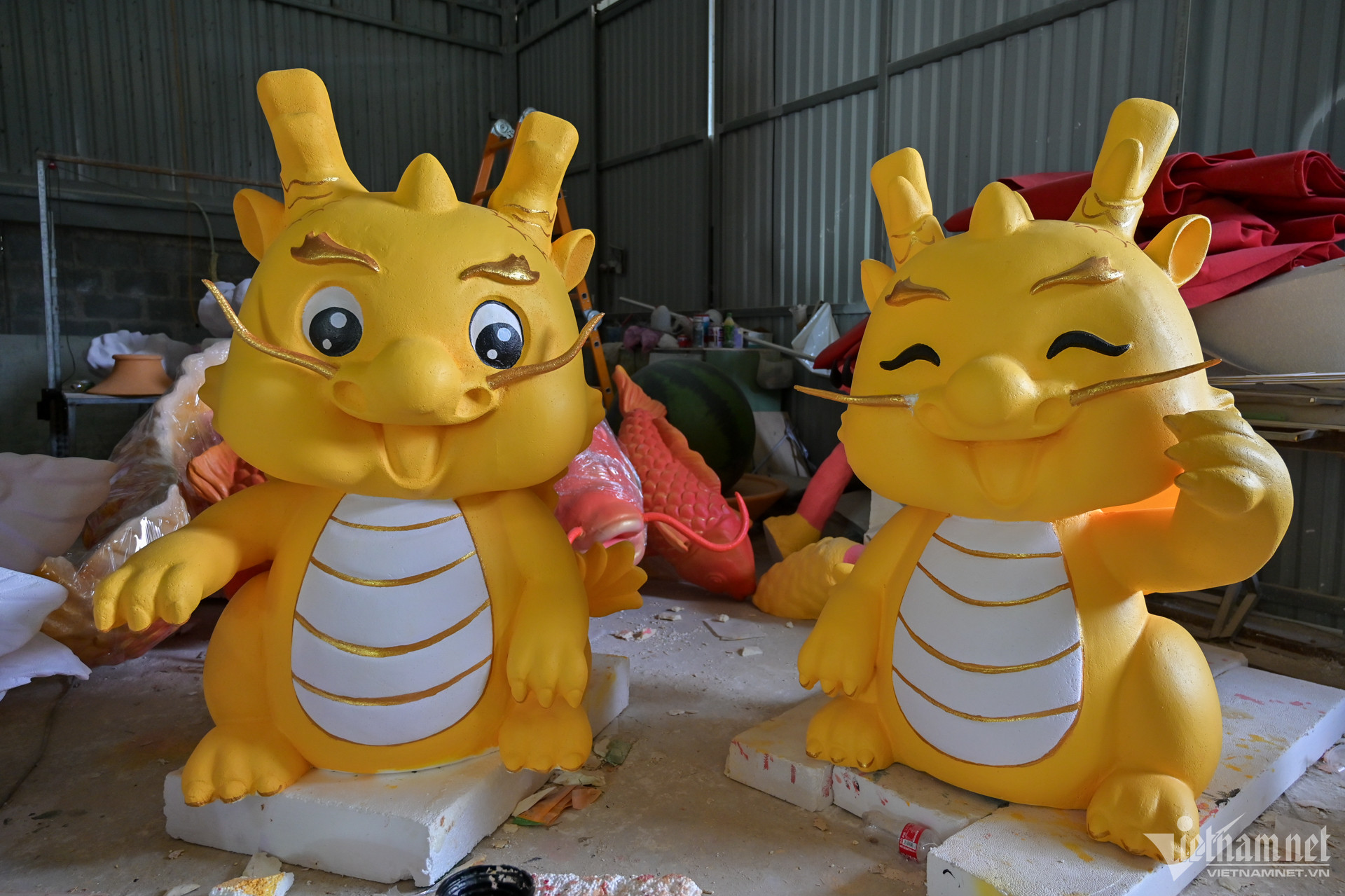 Chưa đến một tháng nữa là đến Tết Nguyên đán Giáp Thìn 2024. Hàng chục công nhân tại một xưởng sản xuất mô hình linh vật (phường Long Phước, TP. Thủ Đức) đang hoàn tất những công đoạn chế tác rồng khổng lồ.