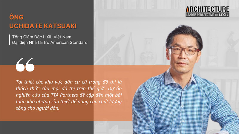 Ông Uchidate Katsuaki - Tổng Giám đốc Lixil Việt Nam chia sẻ: “Tái thiết các khu vực dân cư cũ trong đô thị là thách thức của mọi đô thị trên thế giới. Dự án nghiên cứu của Công ty Cổ phần Kiến trúc Xây dựng TTA Partners đề cập đến một bài toán khó nhưng cần thiết để nâng cao chất lượng sống cho người dân. Đây là một vấn đề lớn cần nhiều nguồn lực của xã hội. Lixil Việt Nam luôn định hướng phát triển gắn liền với mục tiêu xây dựng lối sống văn minh, bền vững. Hy vọng sự đồng hành của Lixil cùng dự án trong chương trình ALP 2021 - 2022 có thể góp phần từng bước cải thiện đời sống người dân, thay đổi diện mạo đô thị, đem đến tương lai sống tốt đẹp hơn cho mọi người, ở mọi nơi”.