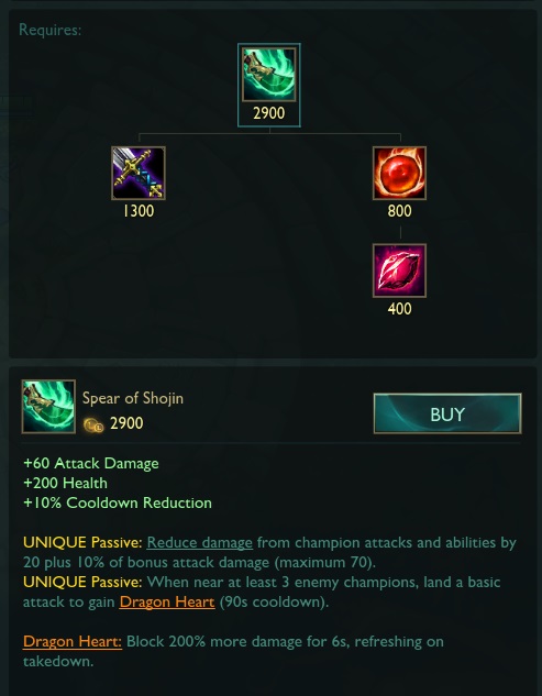 - Nội tại DUY NHẤT: Khi ở cạnh tối thiểu 3 tướng địch, đòn đánh thường nhận thêm hiệu ứng Dragon Heart (90 giây hồi lại).
