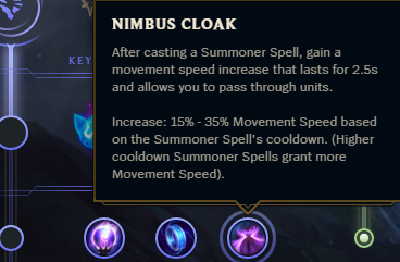 - Tăng: 15%-35% tốc độ di chuyển phụ thuộc vào thời gian hồi lại của Phép Bổ Trợ. (thời gian hồi lại càng lâu càng cho nhiều tốc độ di chuyển).