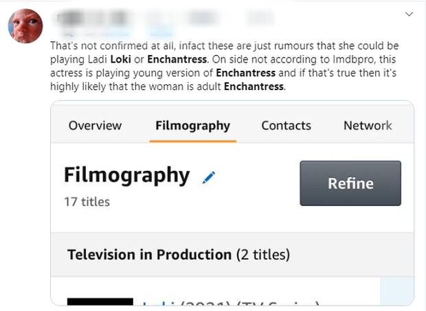 Sau những tin đồn Loki của Tom Hiddleston sẽ trình làng biệt đội siêu anh hùng Squadron Supreme thì mới đây cư dân mạng lại được dịp xôn xao khi xuất hiện cạnh Liki trên hậu trường là một vật kah hoắc. Hình ảnh một nữ diễn viên trong bộ đồ bó được khẳng định chính là nhân vật phản diện Enchantress của MCU. Hoặc nếu không phải Enchantress thì hẳn là đây là phiên bản "tráo hàng" khác của kẻ lừa đảo Loki rồi.