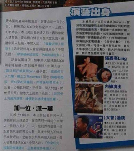 Hai tuần trước, ban biên tập của tạp chí "Face" Hong Kong nhận được thông tin: Muốn chơi trò đồng tính với mỹ nam TVB Bạch Kiện Ân thì bỏ ra 35.000 Đô HK là có thể "quậy tới bến".
