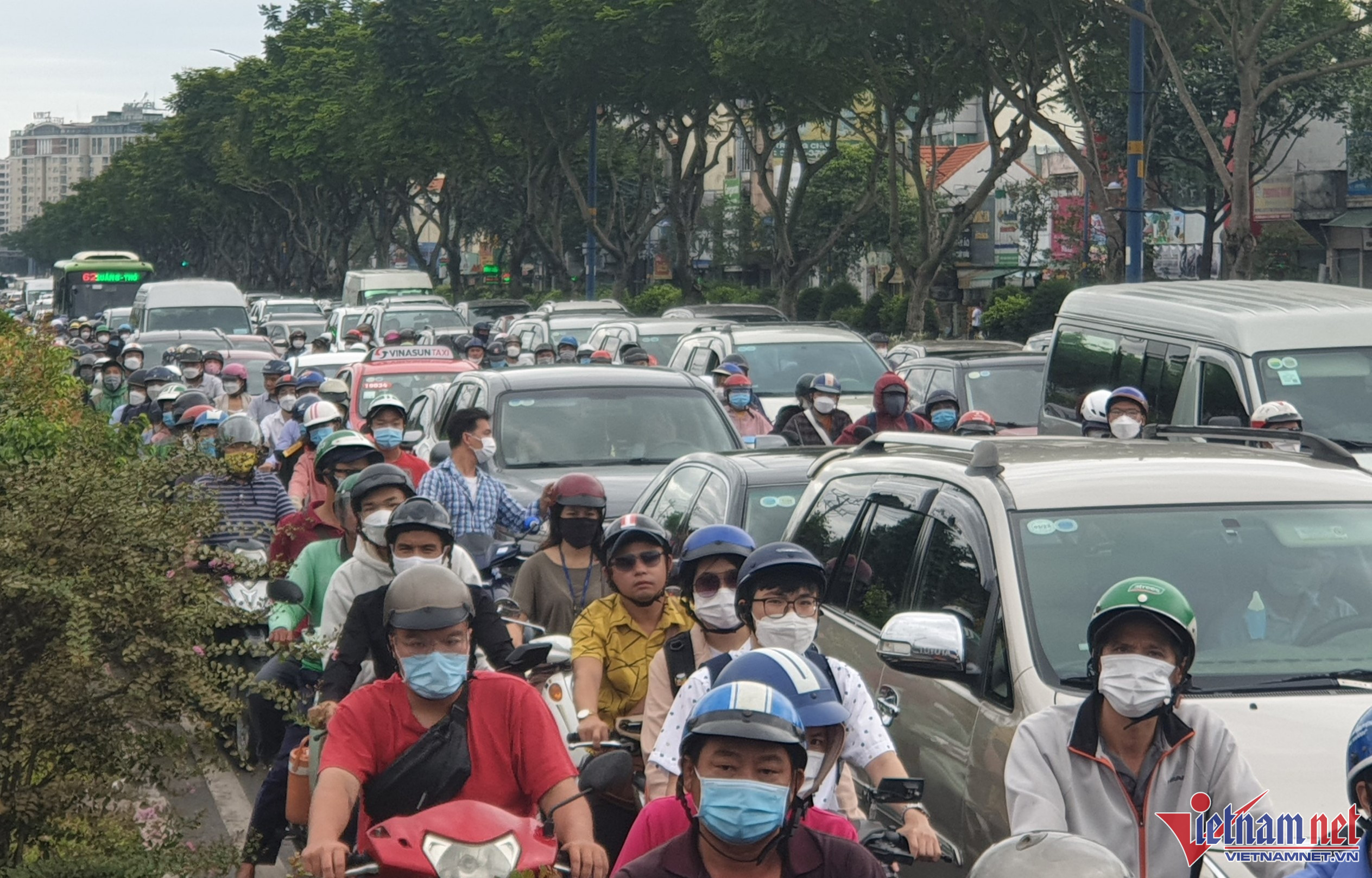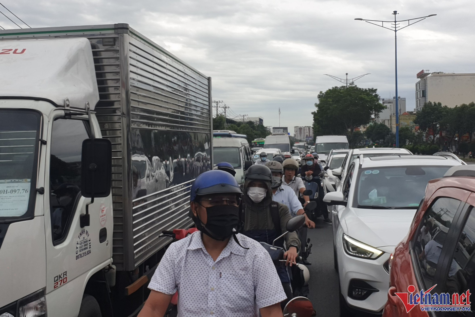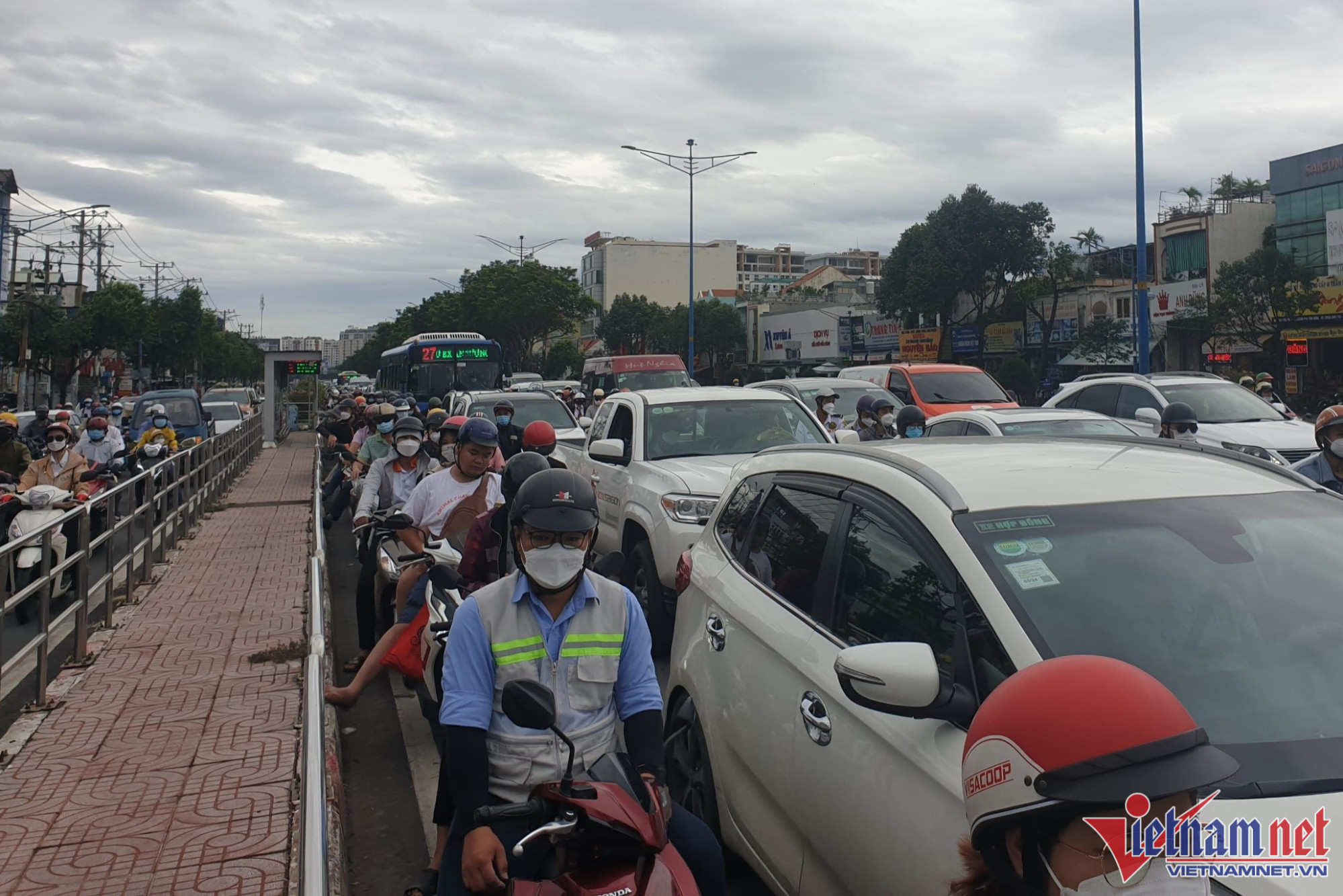Đoạn từ cổng Khu công nghiệp Tân Bình kéo dài đến nút giao Trường Chinh- Phạm Văn Bạch, hàng nghìn phương tiện chôn chân. Xe máy và ô tô ken cứng, nhích từng mét rất khó khăn.