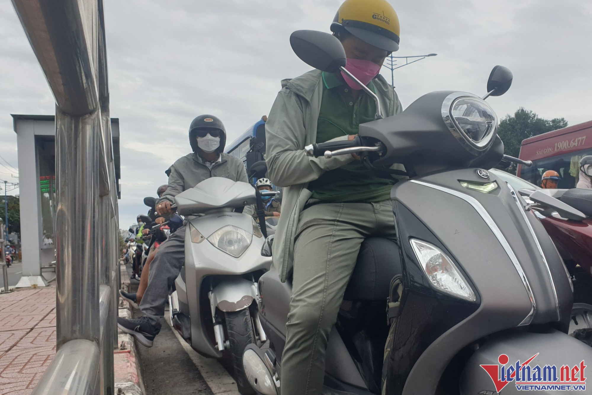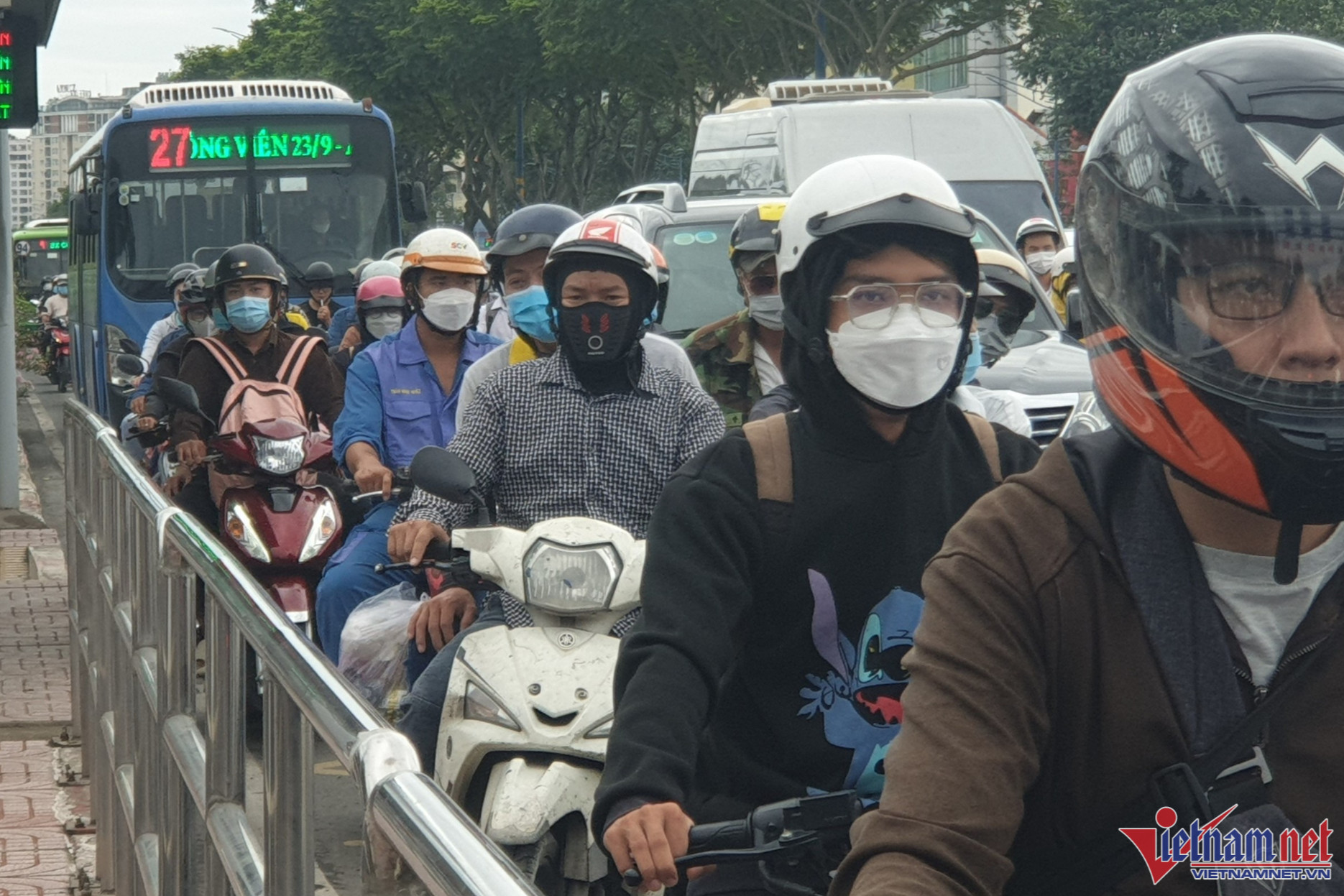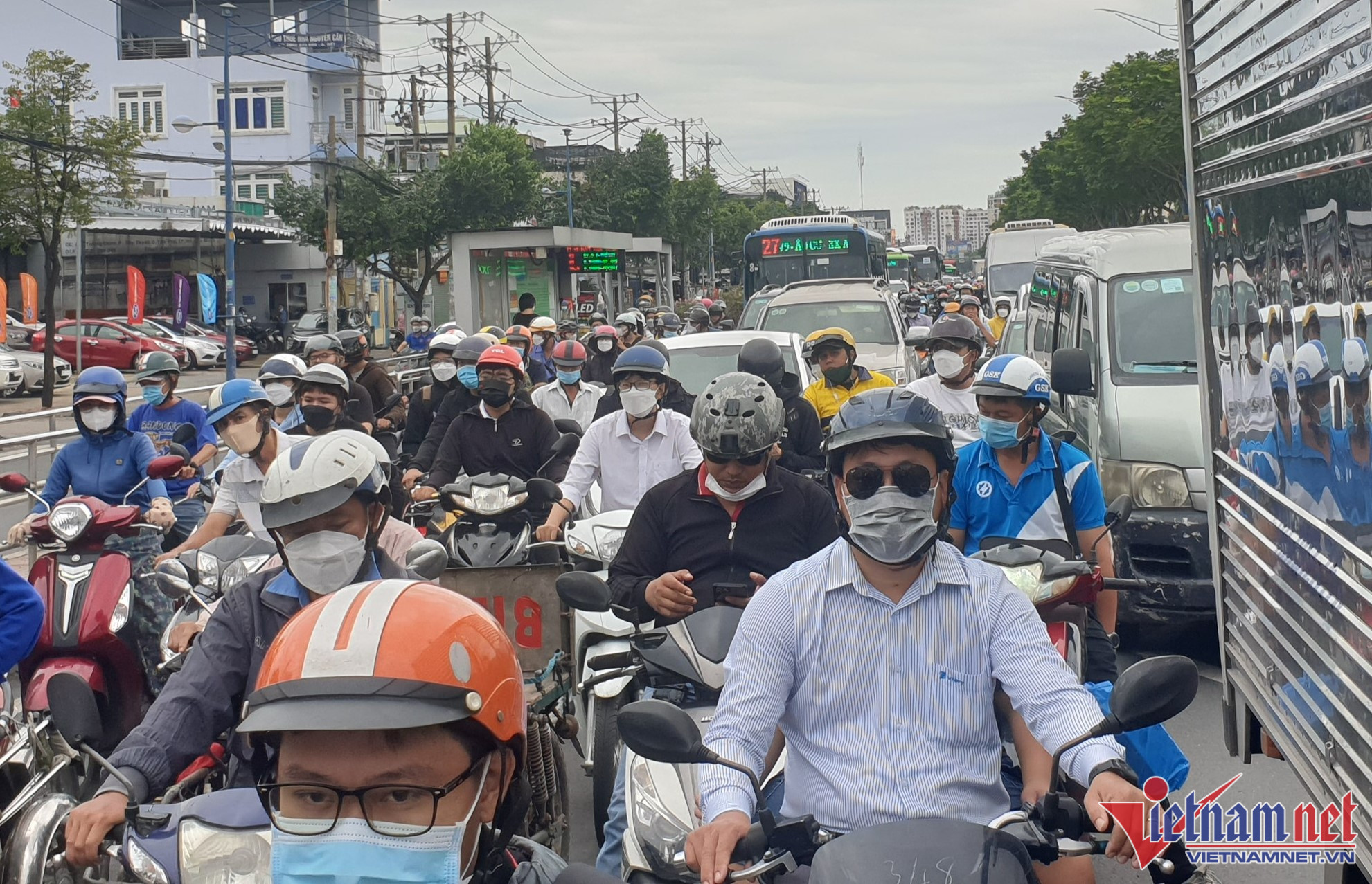 Đoạn từ cổng Khu công nghiệp Tân Bình kéo dài đến nút giao Trường Chinh- Phạm Văn Bạch, hàng nghìn phương tiện chôn chân. Xe máy và ô tô ken cứng, nhích từng mét rất khó khăn.