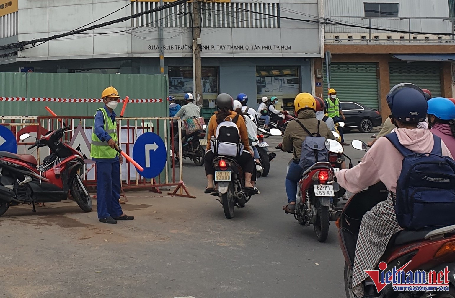 Cụ thể, khu vực này đang được nhà thầu quây tôn, đặt lô cốt tạo thành nút thắt cổ chai. Dòng xe trên đường Trường Chinh, Phạm Văn Bạch đổ vào trung tâm xảy ra xung đột dẫn đến ùn tắc giao thông kéo dài.
