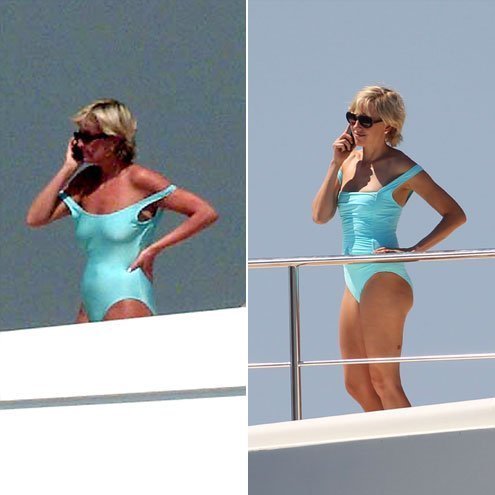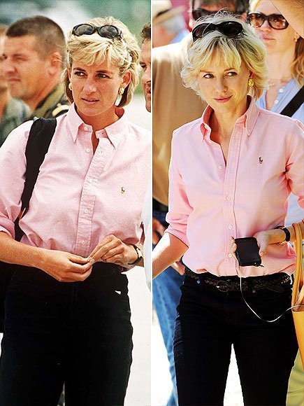 Nữ diễn viên tái hiện lại hình ảnh gợi cảm của cố công nương khi tới xem vở ballet "Hồ Thiên Nga" ở London tháng 6/1997. Naomi Watts thừa nhận rằng cô rất sợ khi vào vai một nhân vật được yêu mến như Diana.