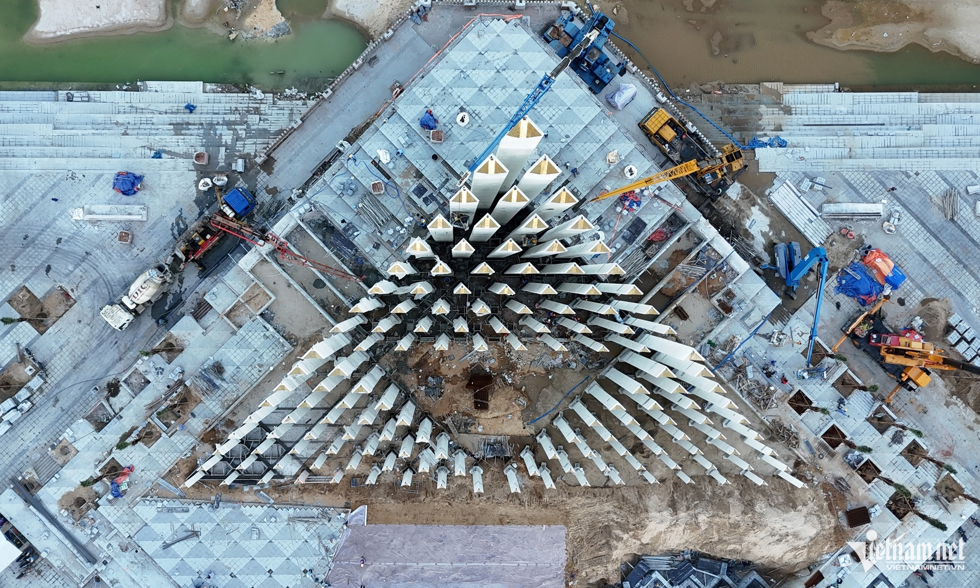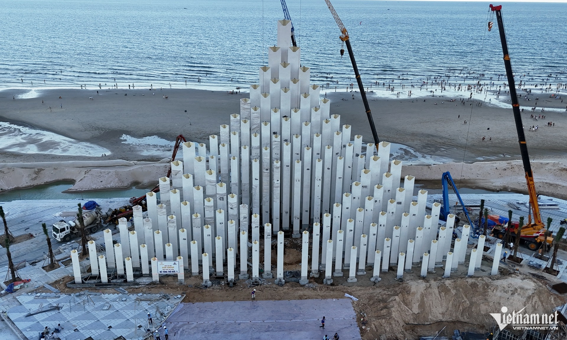 Ghi nhận của PV VietNamNet vào ngày 7/8, trên công trường xây dựng quảng trường Thùy Vân có nhiều nhóm công nhân đang khẩn trương thi công các hạng mục phụ trợ. Trong khi đó, 143 trụ tháp Tam Thắng đã được dựng lên, đang tiếp tục hoàn thiện.