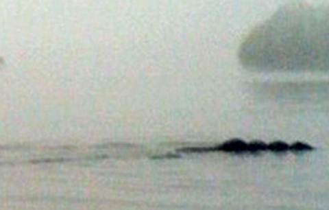 Qua bức ảnh có thể thấy con vật kỳ quái trong truyền thuyết có lớp da màu đen và bốn cục bưới khổng lồ nổi lên trên mặt hồ trong sương mù.