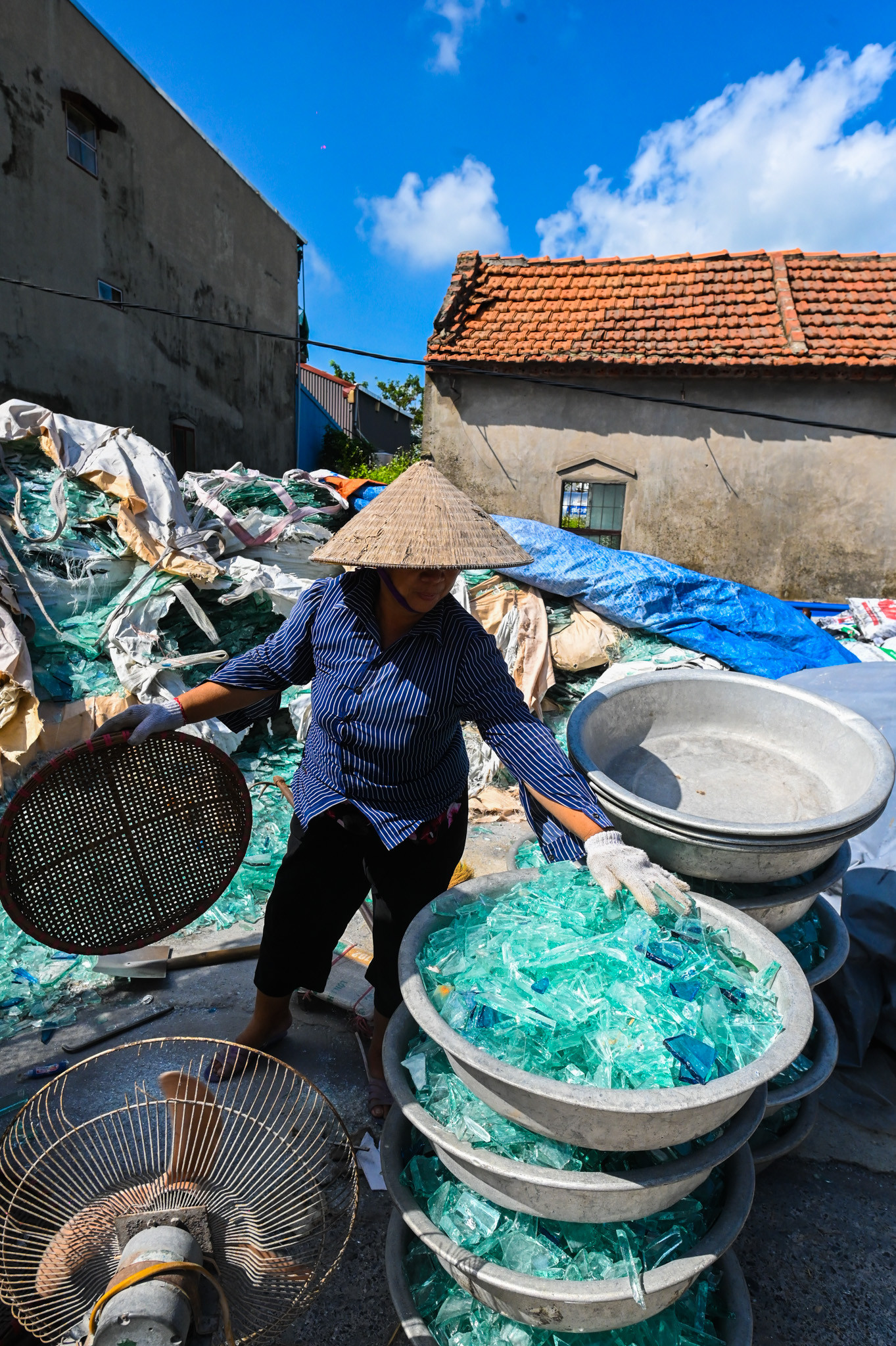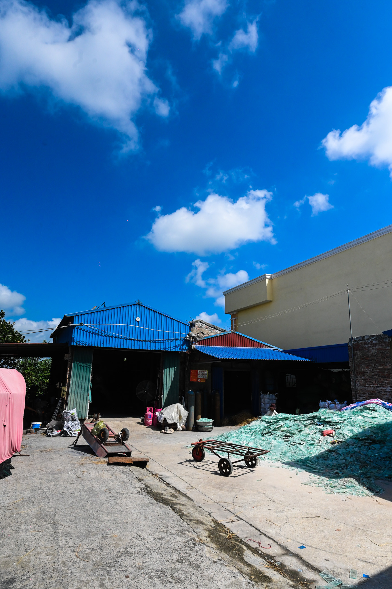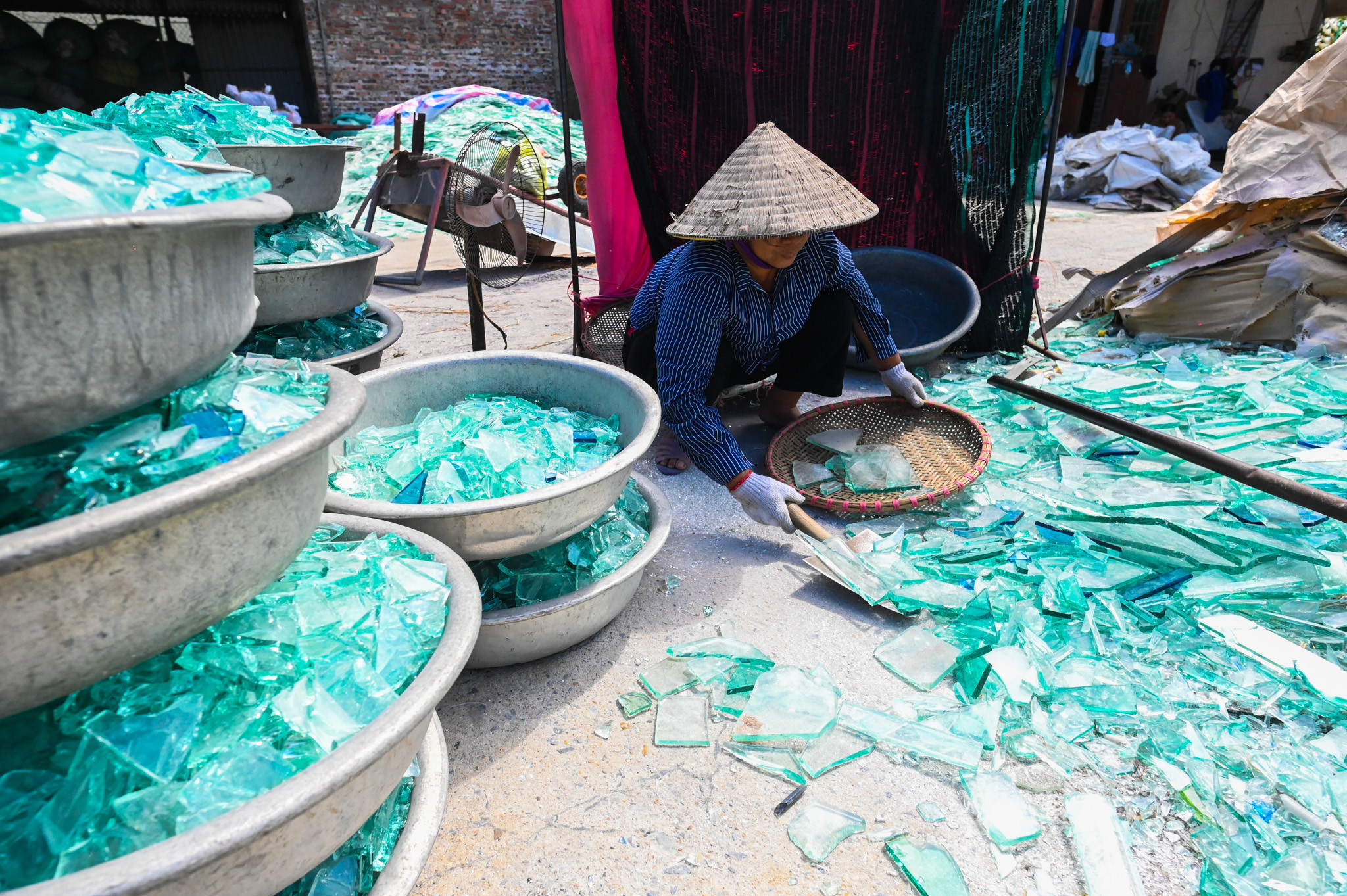Bên trong sân một xưởng sản xuất chất đầy những miếng kính vụn vừa được thu mua về với giá 2.000 đồng/kg. Người làm đang phân loại nguyên liệu, đập thành miếng nhỏ (còn gọi là nhặt mảnh).