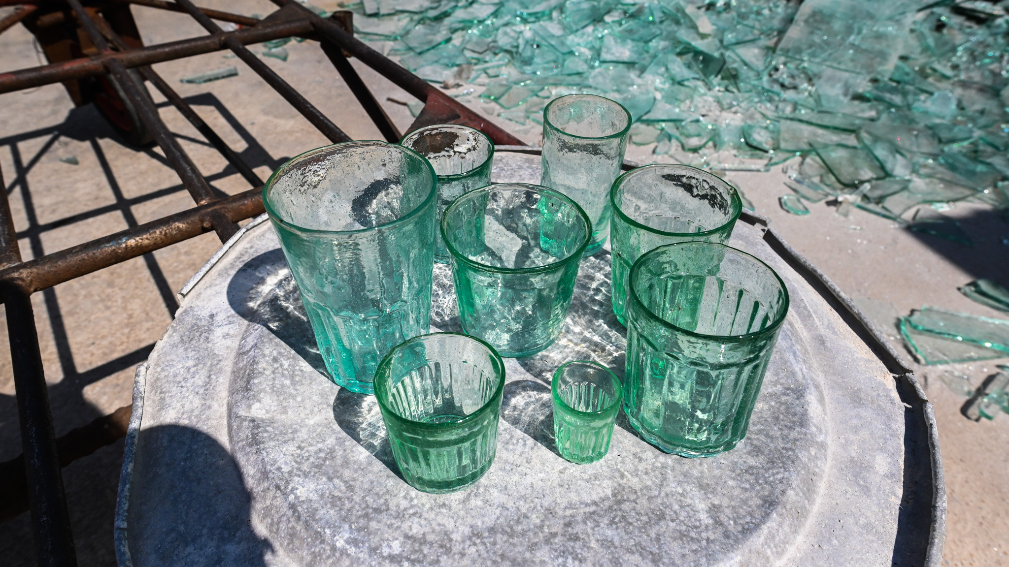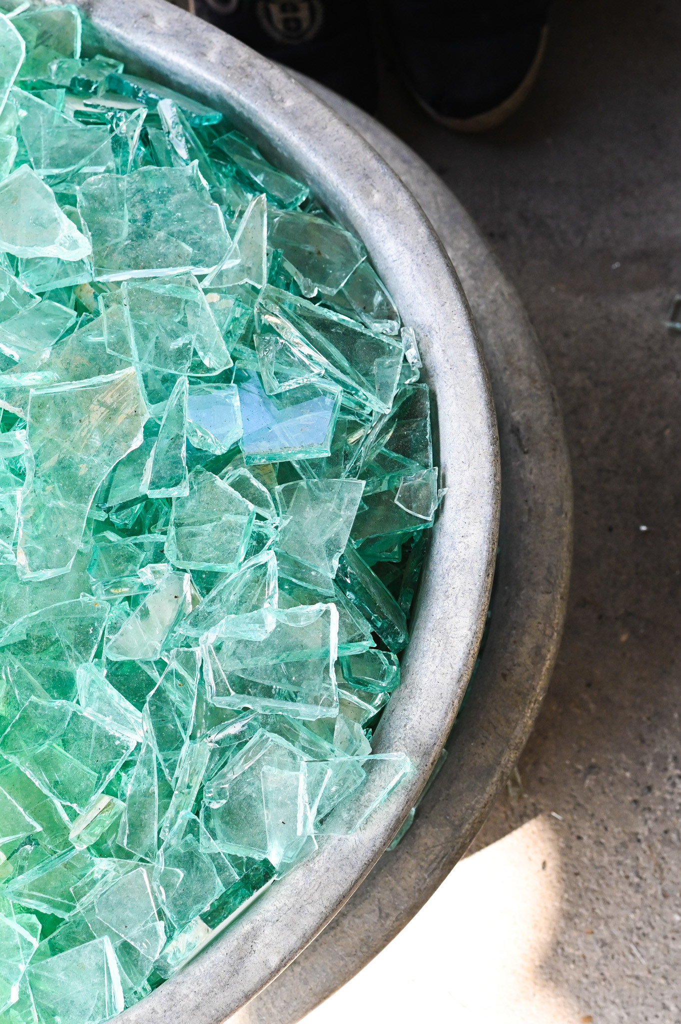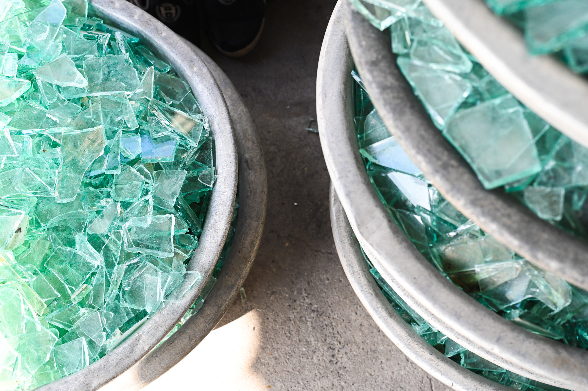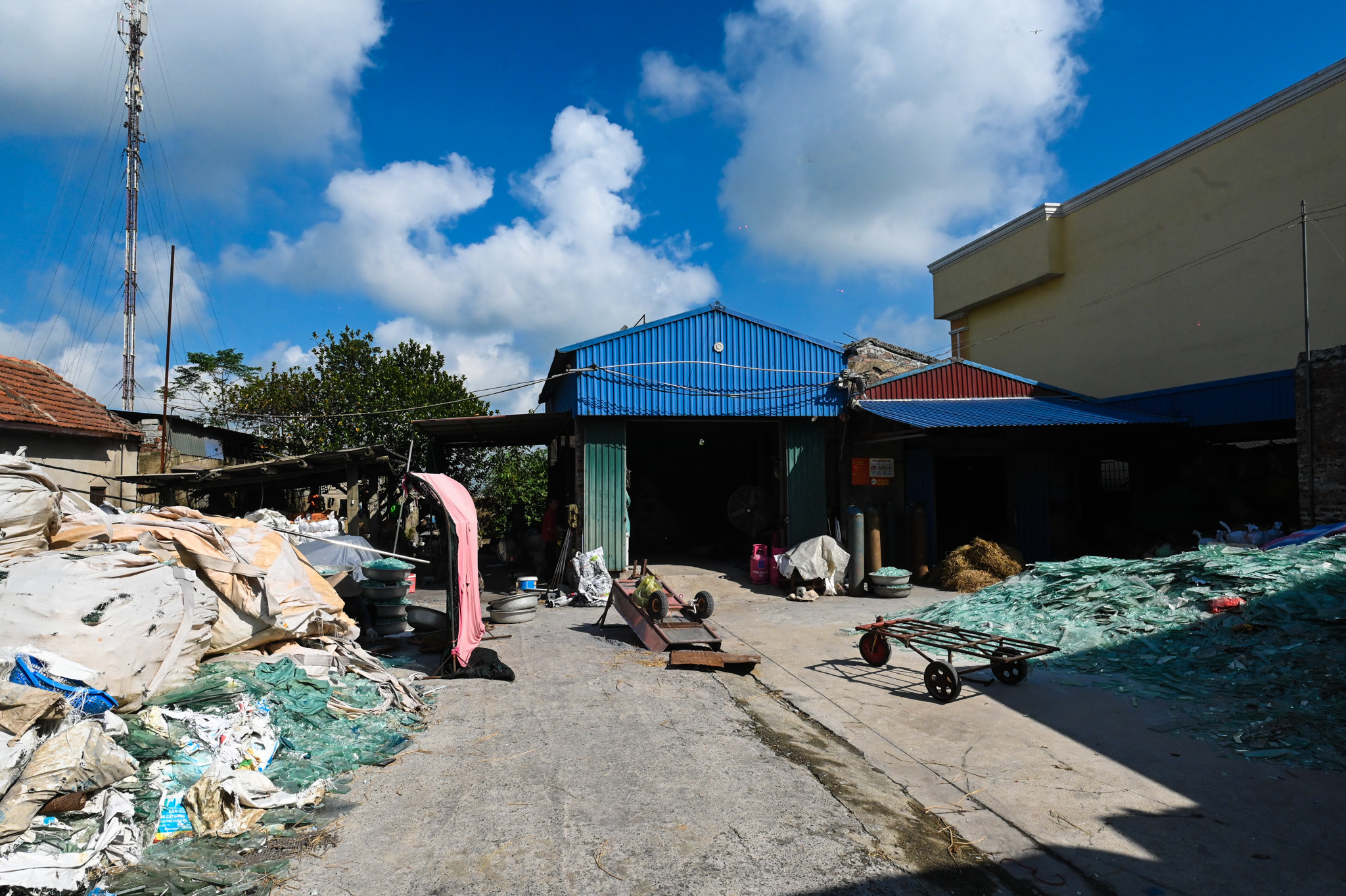 Bên trong sân một xưởng sản xuất chất đầy những miếng kính vụn vừa được thu mua về với giá 2.000 đồng/kg. Người làm đang phân loại nguyên liệu, đập thành miếng nhỏ (còn gọi là nhặt mảnh).