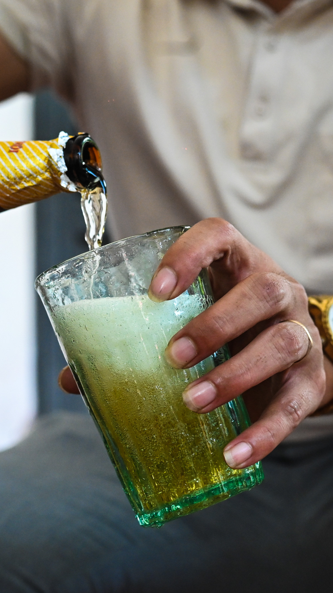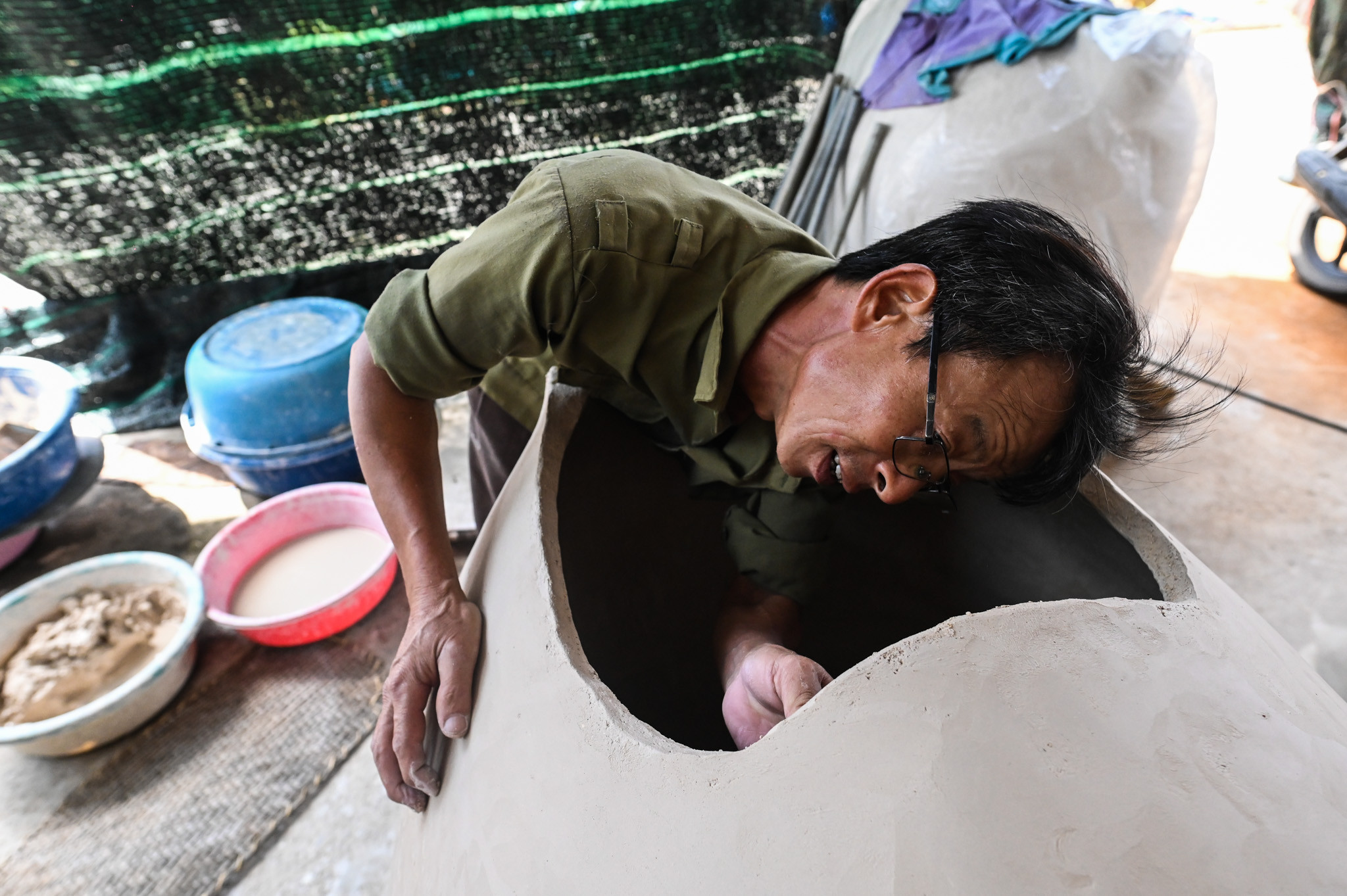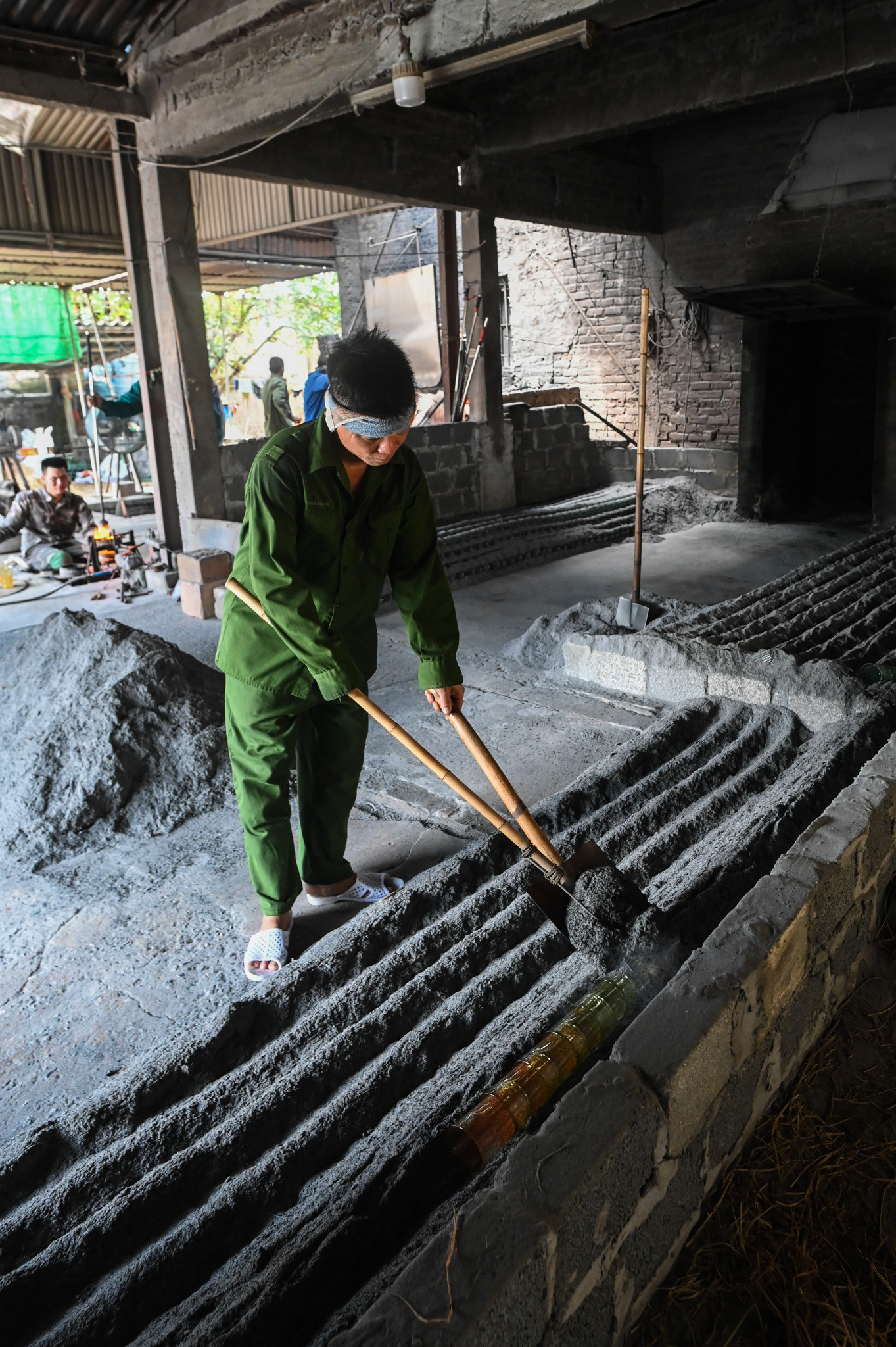 Cốc được xếp thẳng hàng và phủ lên một lớp tro ngay từ khi còn nóng đỏ. Sau khi kết thúc ủ tro, thành phẩm cốc bia sủi bọt sẽ được hoàn thiện.