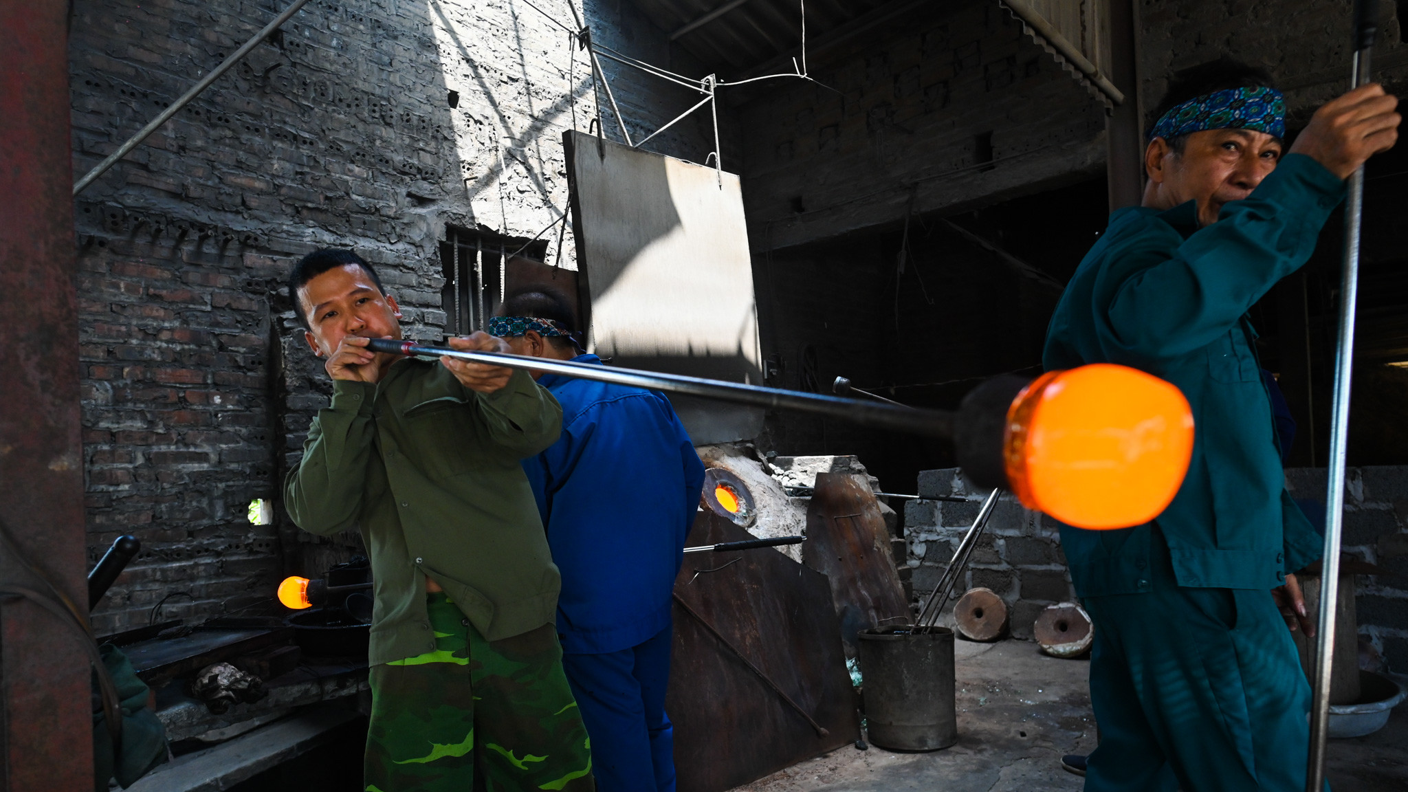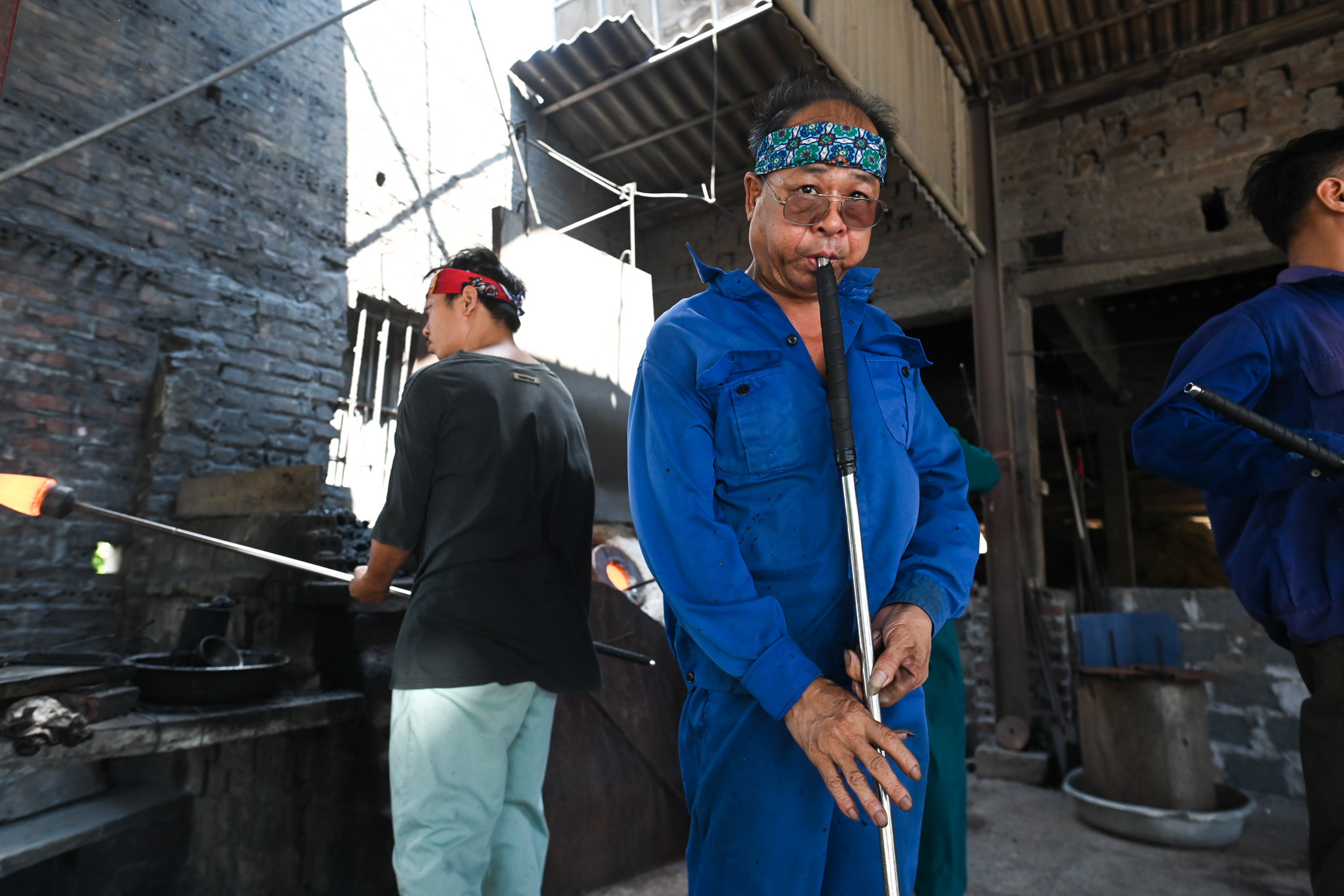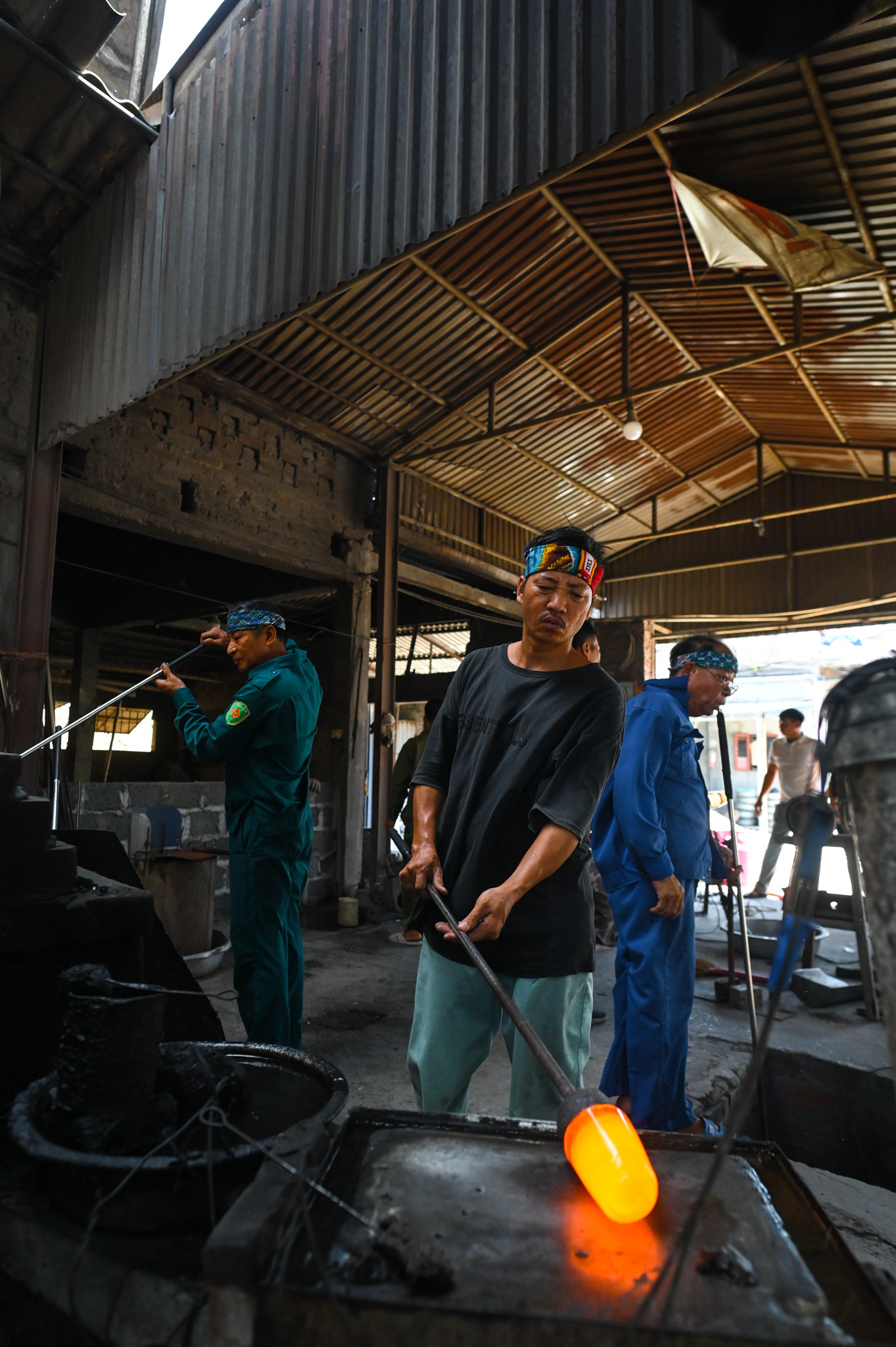 Quá trình luyện thủy tinh mất khoảng 6 tiếng. Sau khi thủy tinh đã chảy, gần chục nhân công bắt tay vào thổi cốc. Họ làm việc trực tiếp bên cạnh lò nung với sức nóng lớn.