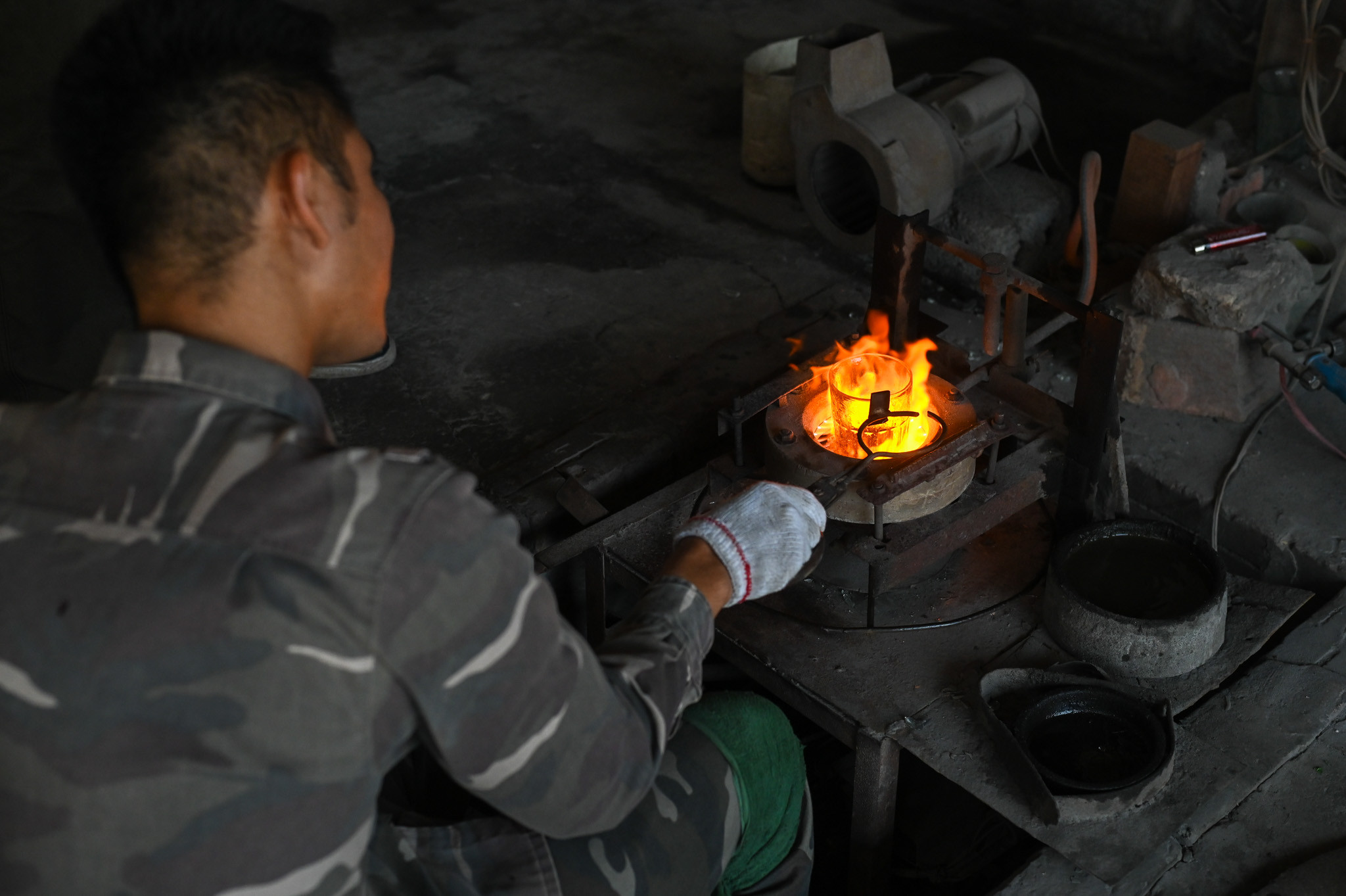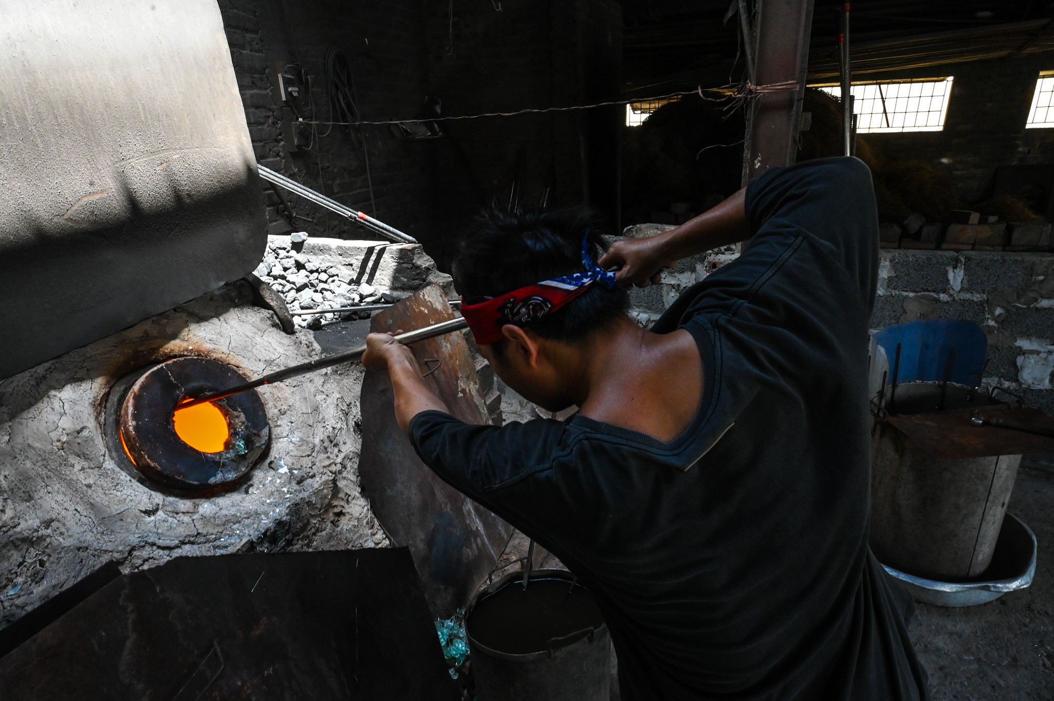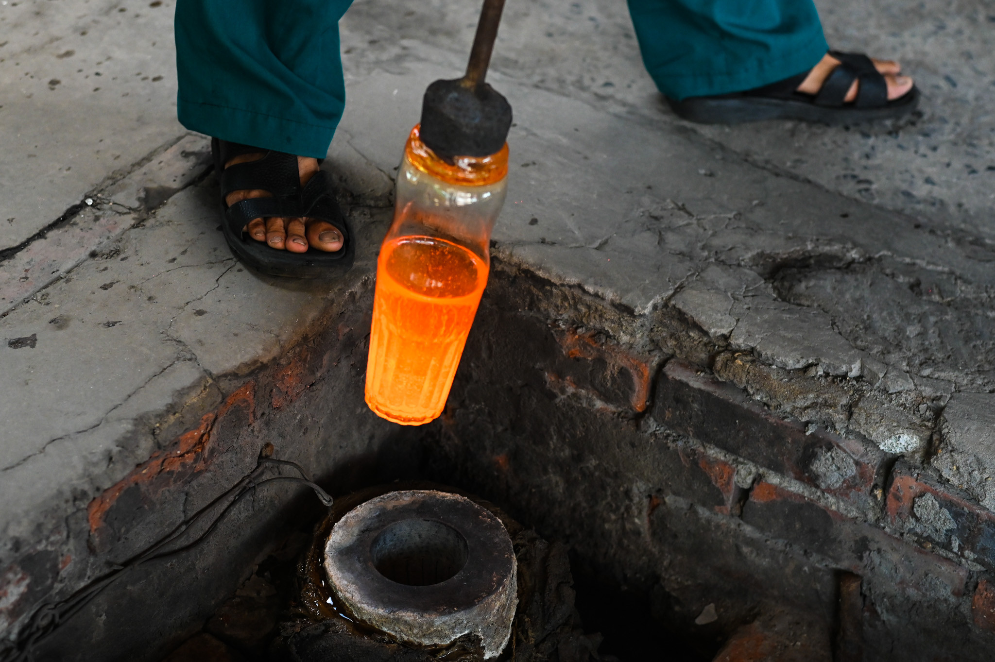Quá trình luyện thủy tinh mất khoảng 6 tiếng. Sau khi thủy tinh đã chảy, gần chục nhân công bắt tay vào thổi cốc. Họ làm việc trực tiếp bên cạnh lò nung với sức nóng lớn.