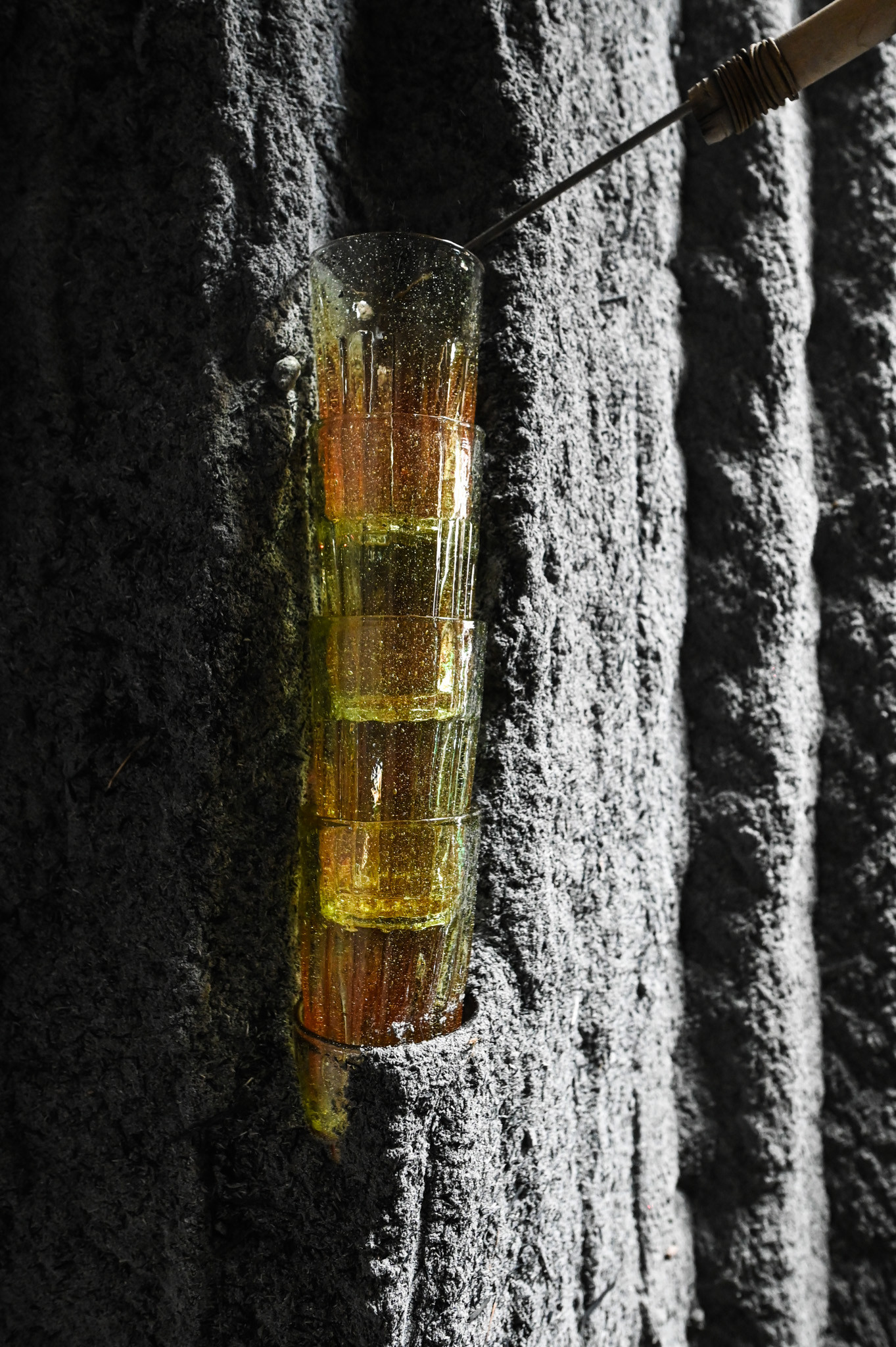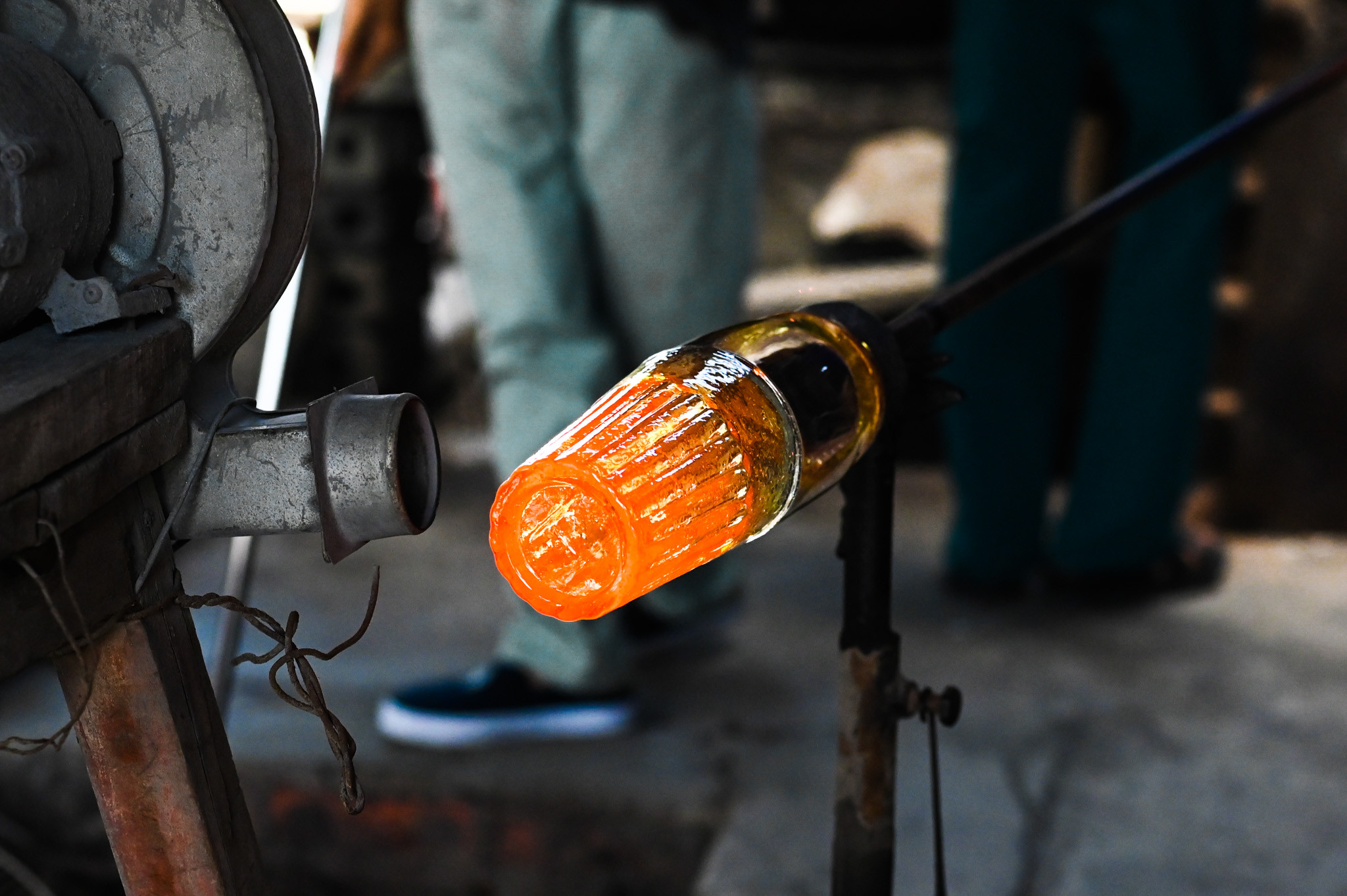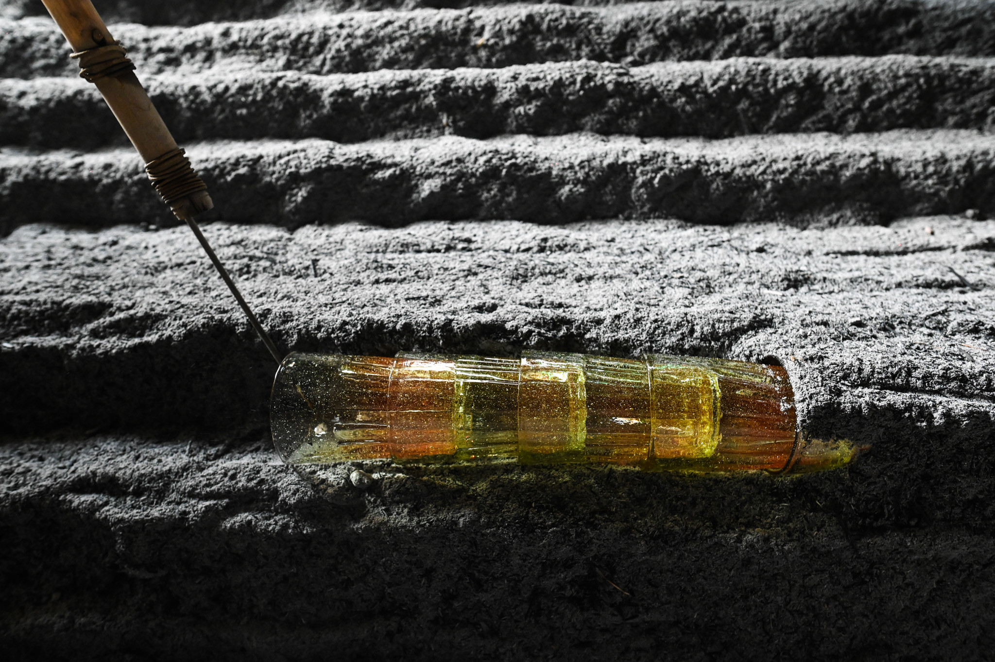Thủy tinh nóng chảy được thợ lấy ra khỏi lò bằng chiếc gậy với một lượng vừa đủ, vẫn còn rực đỏ, rồi lăn qua nước lạnh và mỡ để tạo độ nhẵn bên ngoài.