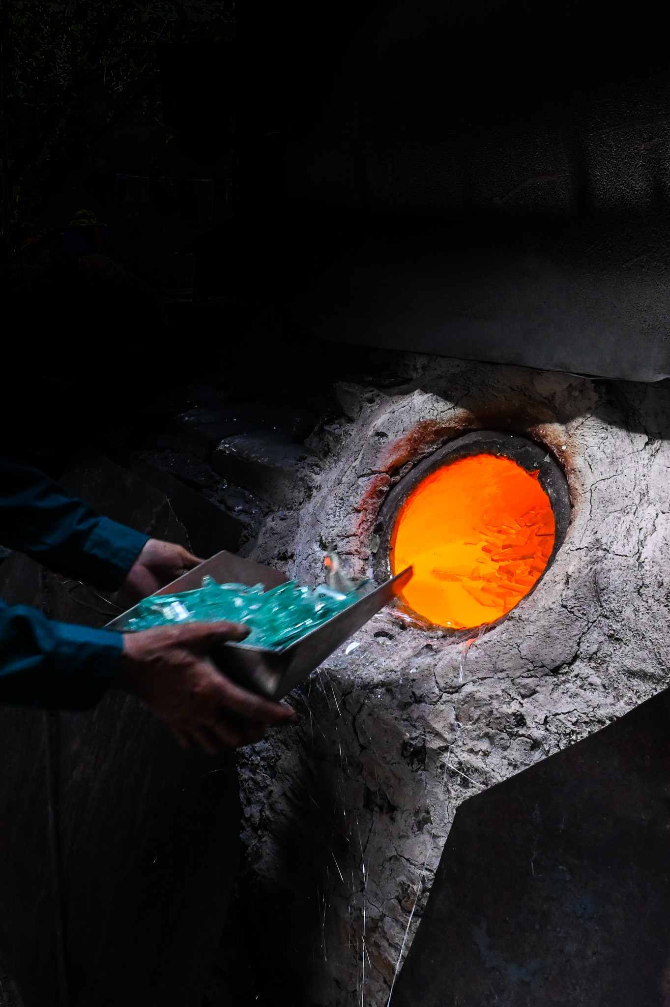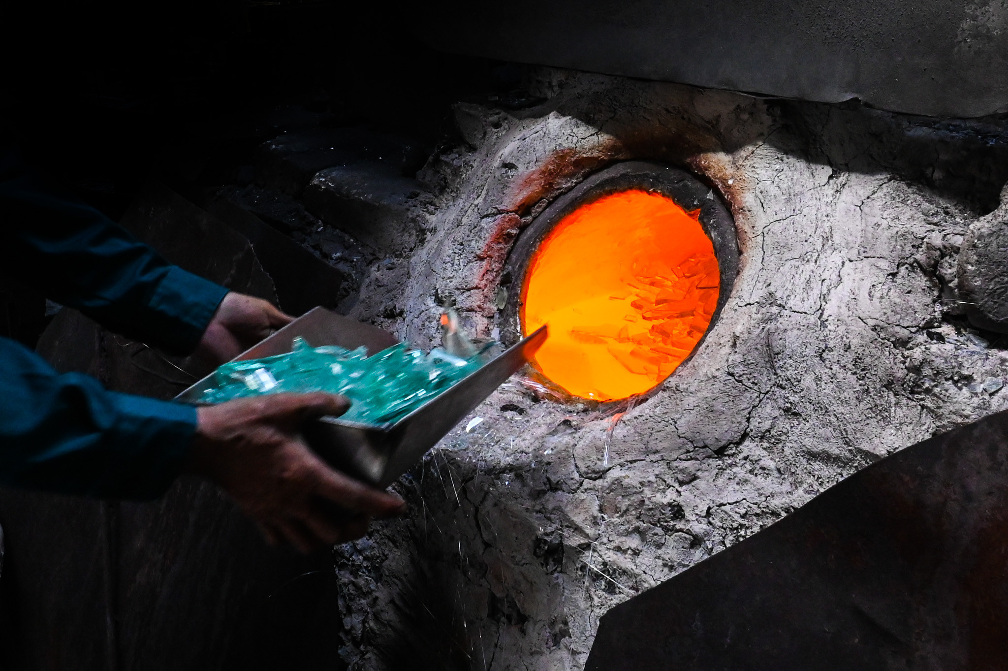 Thủy tinh sau khi phân loại được đưa vào khu vực lò nung. Nguyên liệu đủ tiêu chuẩn là các mảnh vỡ có màu sắc sáng trong, đồng đều, không lẫn keo dính, giấy vụn...
