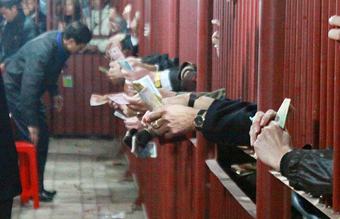 | Những cánh tay tới tấp chìa tiền mua ấn ở Đền Trần (ảnh: Nguyễn Hoàng) |