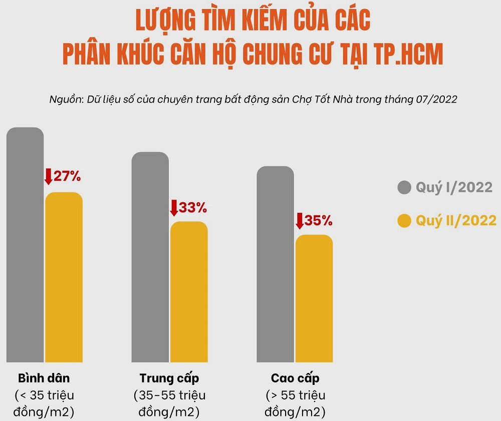 Theo dữ liệu mới công bố từ chuyên trang bất động sản Chợ Tốt Nhà, các chỉ số quan tâm và tìm kiếm căn hộ chung cư trong quý II/2022 tại TP.HCM đã giảm đồng loạt trên toàn bộ các phân khúc từ bình dân, trung cấp và cao cấp.