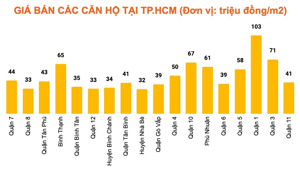 Tại quận Bình Thạnh, việc tăng giá mạnh trong tháng 5 và tháng 6 đã đẩy giá bán trung bình căn hộ chung cư tại đây đạt mốc 65 triệu đồng/m2, tăng 12 triệu đồng/m2 so với cuối quý I/2022.