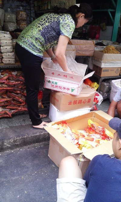 Tại khu vực chợ Bình Tây, chúng tôi cũng thấy nhiều chủ sạp sau khi lấy hàng ra khỏi hộp các-tông có in chữ Trung Quốc đã bỏ vỏ hộp khác, cho lên quầy, kệ lẫn với các sản phẩm Việt Nam đã được bày sẵn.