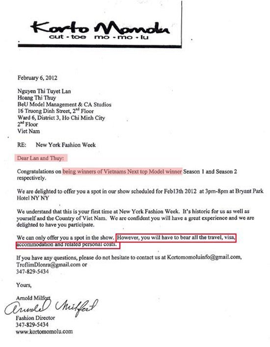 Không chỉ thế, việc hai cô gái được mời "chay" khiến độc giả cảm thấy rất băn khoăn. Theo lẽ thường, khi được mời xuất hiện trong New York Fashion Week, những người mẫu sẽ được tài trợ toàn bộ kinh phí từ ăn tới trong suốt thời gian lưu diễn. Thế nhưng trong thư gửi cho Hoàng Thùy và Tuyết Lan, Ban tổ chức ghi rất rõ các cô gái sẽ chịu toàn bộ kinh phí đi lại cũng như ăn ở - một tiền lệ chưa từng có tại show diễn danh tiếng này đối với những người mẫu được xem là "khách mời". Trong lịch sử của New York Fashion Week, những người mẫu được góp mặt tại show diễn này đều thuộc hàng có "số má" trong làng catwalk thế giới, điều mà Hoàng Thùy và Tuyết Lan biết rõ họ chưa thể có tính đến thời điểm hiện tại.