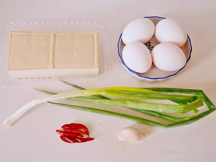 - 330gr đậu phụ, 4 quả trứng gà, 2 - 3 tép tỏi, 1 thìa canh dầu hào, 1 thìa canh nước mắm, 1/2 thìa cà phê dầu mè, 1/2 thìa cà phê gia vị, 1/4 thìa cà phê đường, 1/4 thìa tiêu xay, 3 thìa canh nước lọc, hành hoa, ớt khô.