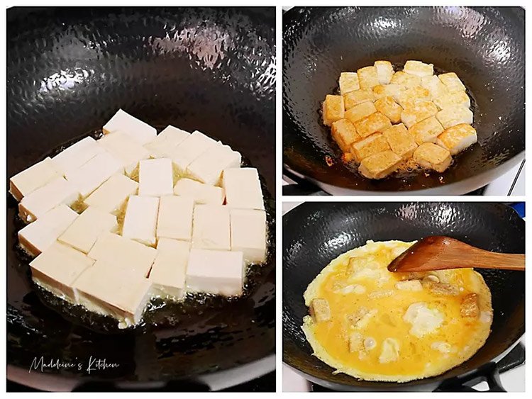 Trứng đánh tan, thêm chút gia vị. Đổ trứng lên ngập đậu, đun trên lửa vừa. Đến khi trứng đặc lại, dùng thìa ấn nhẹ, tách các miếng đậu ra sao cho trứng vẫn bọc kín bề mặt trên của đậu. Khéo léo múc từng miếng đậu ra khỏi chảo, để riêng.