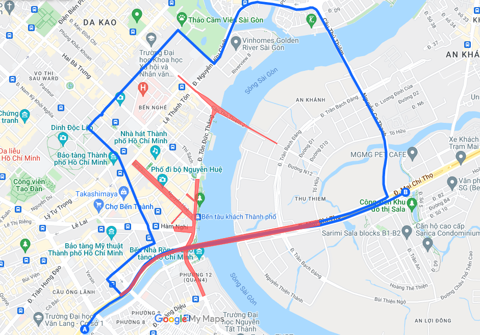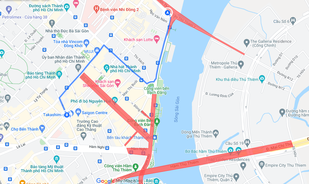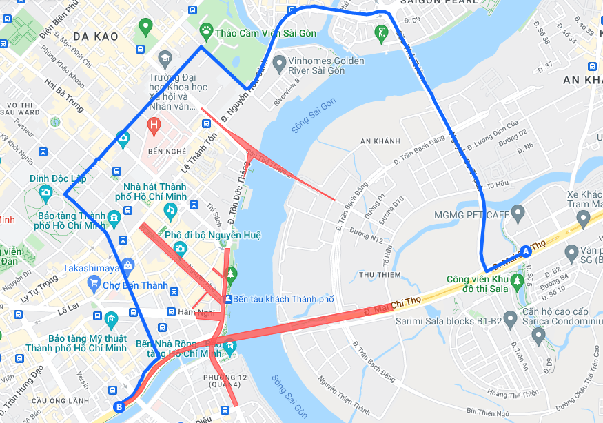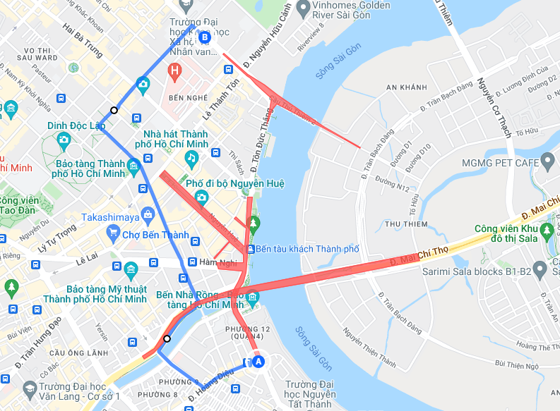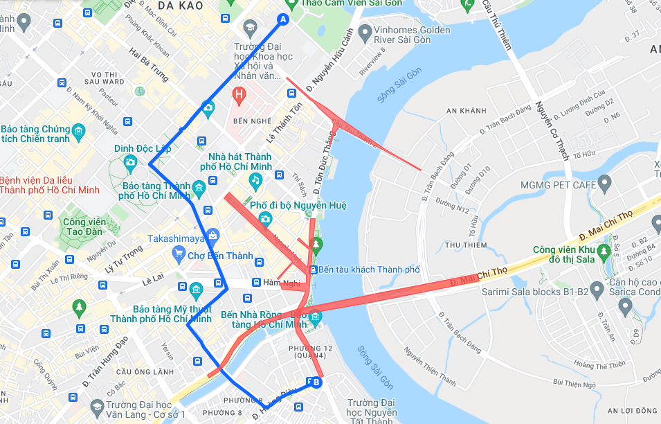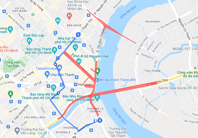 Lộ trình tham khảo 1: đường Nguyễn Huệ → Lê Lợi → Nam Kỳ Khởi Nghĩa → Hàm Nghi → Tôn Đức Thắng.