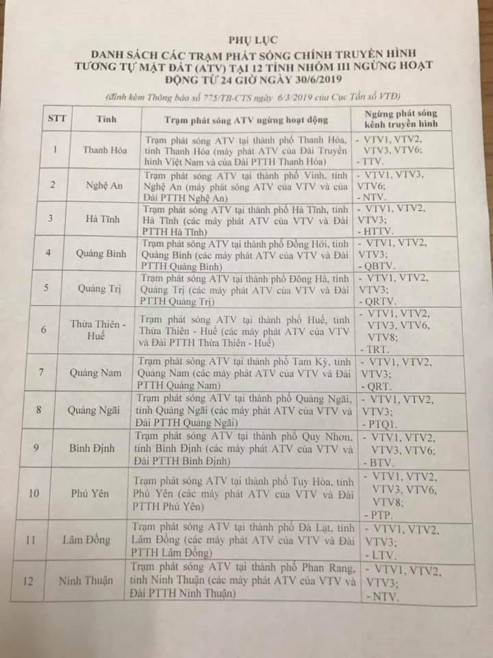 Ngừng phát sóng truyền hình tương tự mặt đất đối với các trạm phát sóng chính tại 12 tỉnh Nhóm III (Thanh Hóa, Nghệ An, Hà Tĩnh, Quảng Bình, Quảng Trị, Thừa Thiên - Huế, Quảng Nam, Quảng Ngãi, Bình Định, Phú Yên, Lâm Đồng, Ninh Thuận) từ 24 giờ ngày 30/6/2019.