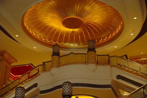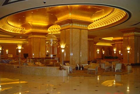 Nói về nội thất, trong lòng Emirates Palace là một thế giới cung điện khổng lồ với những nét xa hoa, lộng lẫy từ những ánh đèn trang trí đến những mái vòm được nạm vàng và đá cẩm thạch.