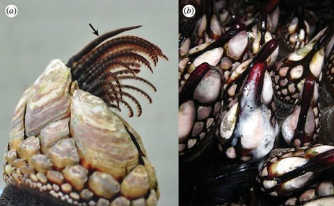 Ảnh (a) cho thấy dương vật ở trạng thái thư giãn (có dấu mũi tên) bên cạnh các chân dùng cho việc ăn uống của một con hàu Pollicipes polymerus. Trong ảnh (b), các con hàu đang thả tinh trùng vào nước lúc thủy triều thấp. Ảnh: Proceedings of the Royal Society B |