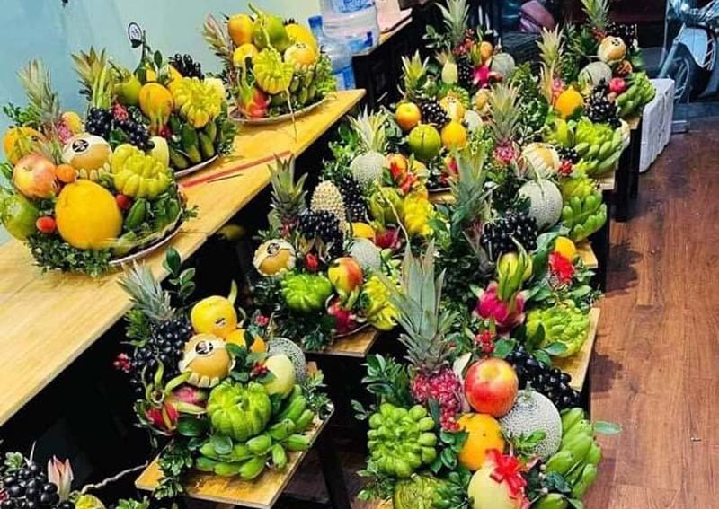 Không ế ẩm như đào, quất, mâm ngũ quả thờ Tết đang cực kỳ đắt khách. Có mâm giá lên tới 3,5 triệu đồng, khách vẫn ồ ạt đặt mua, chủ hàng làm không kịp bán.