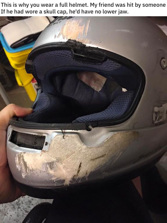 Trong trường hợp này, người lái motor đã suýt mất hàm dưới nếu không đội mũ bảo hiểm