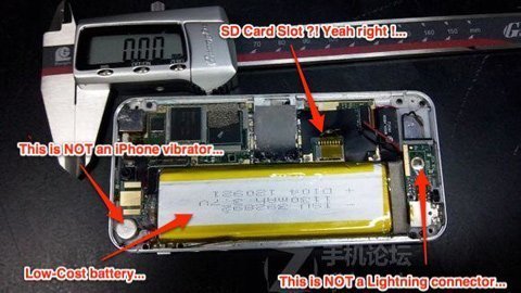 Để chứng minh cho nhận định của mình, Slashgear phân tích rằng tất cả các bức hình trong loạt ảnh đều có yếu tố không chính xác, chẳng hạn như thiết bị này có khe cắm thẻ nhớ microSD, một loại pin không thương hiệu giá rẻ với kích thước nhỏ hơn pin của iPhone 5 và không có cổng kết nối Lightning.