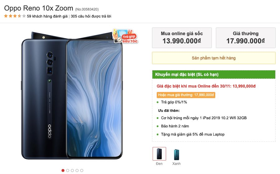 Oppo Reno Zoom 10x giảm mạnh còn 13,99 triệu đồng. |