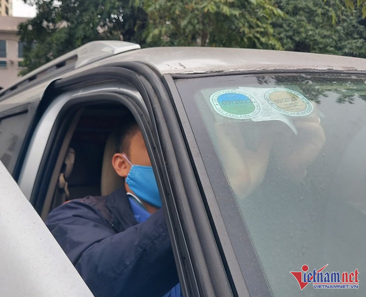 Đăng kiểm viên dán tem đăng kiểm sau khi xe đủ điều kiện. Ảnh: N. Huyền