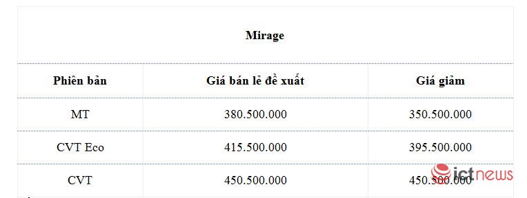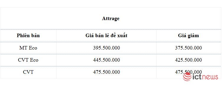 Hai mẫu sedan là Mirage và Attrage đều đang được giảm giá khá tốt. Mitsubishi Mirage giảm 20 - 40 triệu đồng đi kèm cả giảm giá bán lẻ và quà tặng theo từng phiên bản. Trong khi Mitsubishi Attrage giảm giá 20 triệu đồng đối với phiên bản MT và CVT Eco.