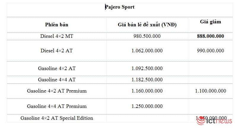 Mitsubishi Pajero Sport được giảm giá “sập sàn” ở đại lý. Giá bán Mitsubishi Pajero Sport Diesel 4×2 MT đang giảm tới hơn 100 triệu đồng, trong đó mức giảm giá bán lẻ lên tới 92 triệu đồng đi kèm bộ phụ kiện; bản Diesel 4×2 AT giảm 72 triệu đồng; phiên bản Pajero Sport Gasoline 4×2 AT Premium giảm 50 triệu đồng.