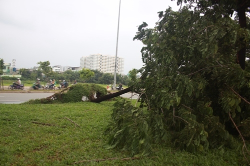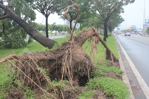 Người dân cho biết, vào khoảng 14h, trong cơn mưa lớn xuất hiện gió lốc rất mạnh đã khiến gần chục cây xanh trên đại lộ Võ Văn Kiệt (đoạn từ giao với đường Hồ Học Lãm đến An Dương Vương) ngã đổ, bật gốc