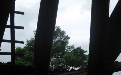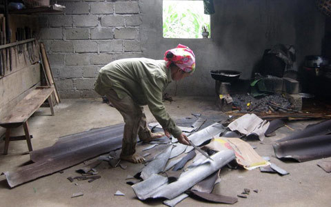 Chị Nguyễn Thị Tuyết (52 tuổi, thôn Kim Thọ, xã Hương Quang) vừa thu dọn nhà cửa tan hoang vừa kể lại: “Vào khoảng 17h chiều 30/7, trong lúc tôi đang nhóm bếp nấu cơm buổi tối thì một trận lốc xoáy bất ngờ ập đến, cuốn bay cả mái tôn trên nhà.