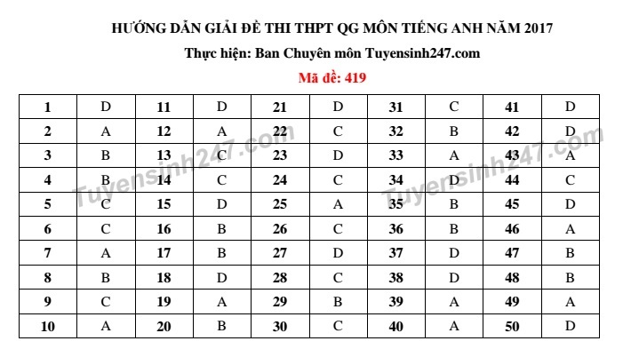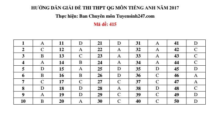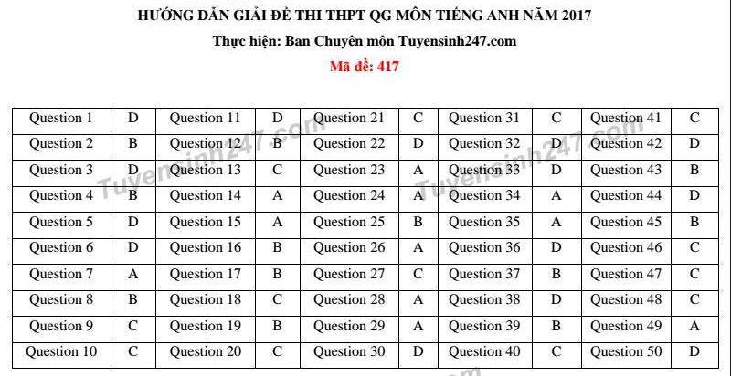 Lời giải tham khảo môn Tiếng Anh mã đề 417
