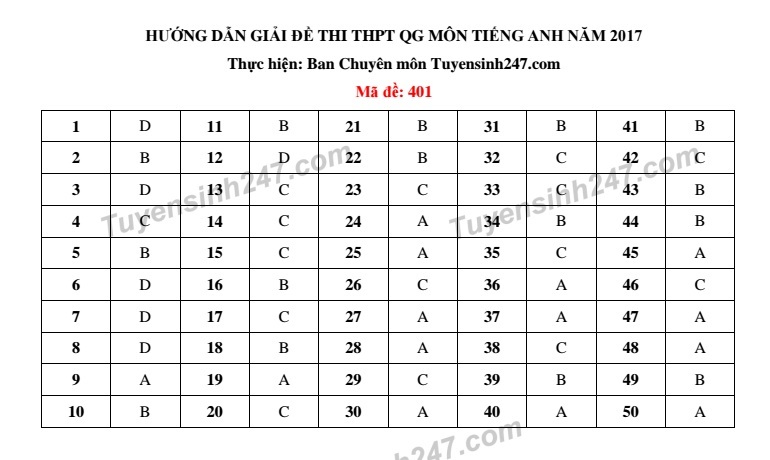 Lời giải tham khảo môn Tiếng Anh mã đề 401